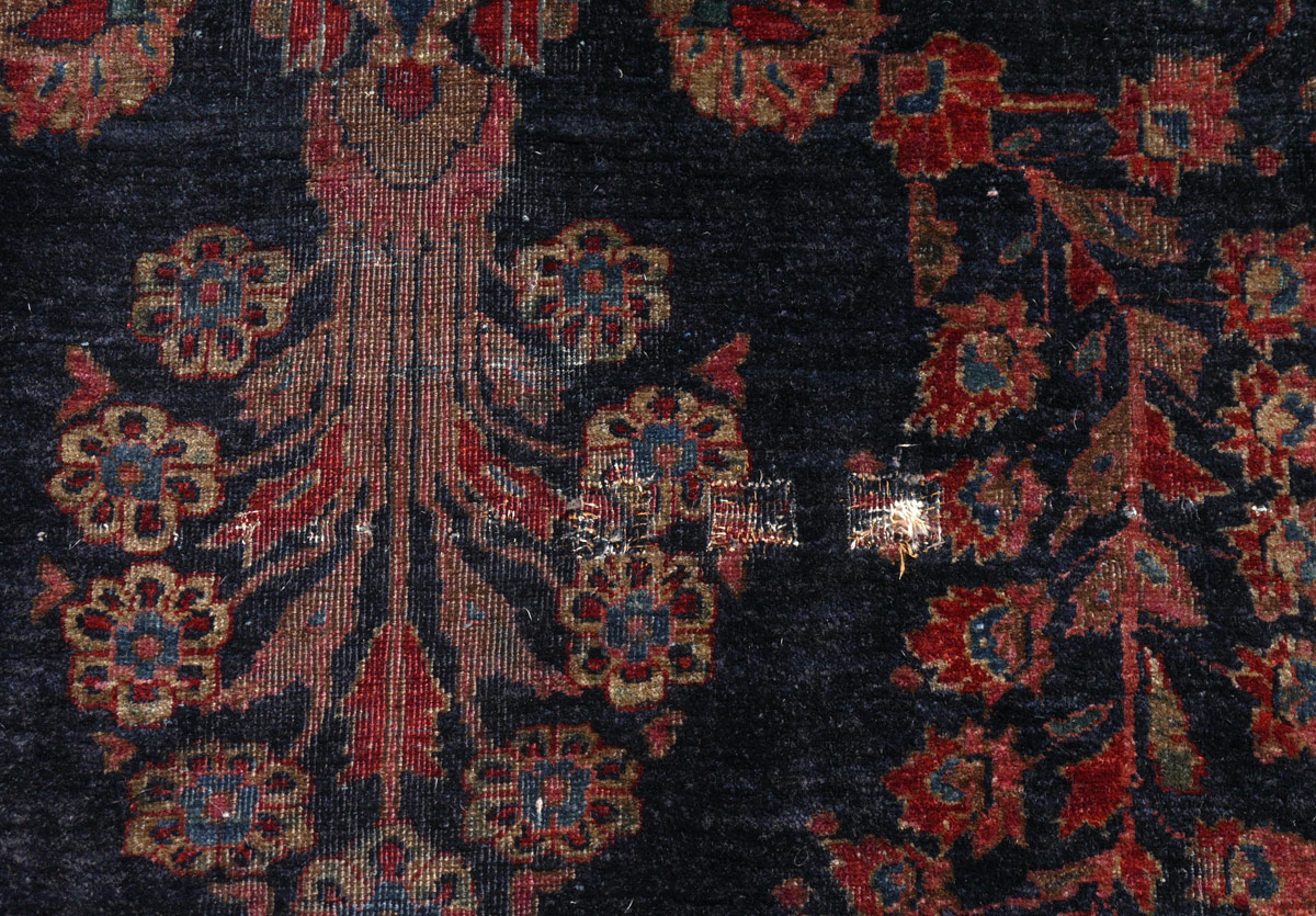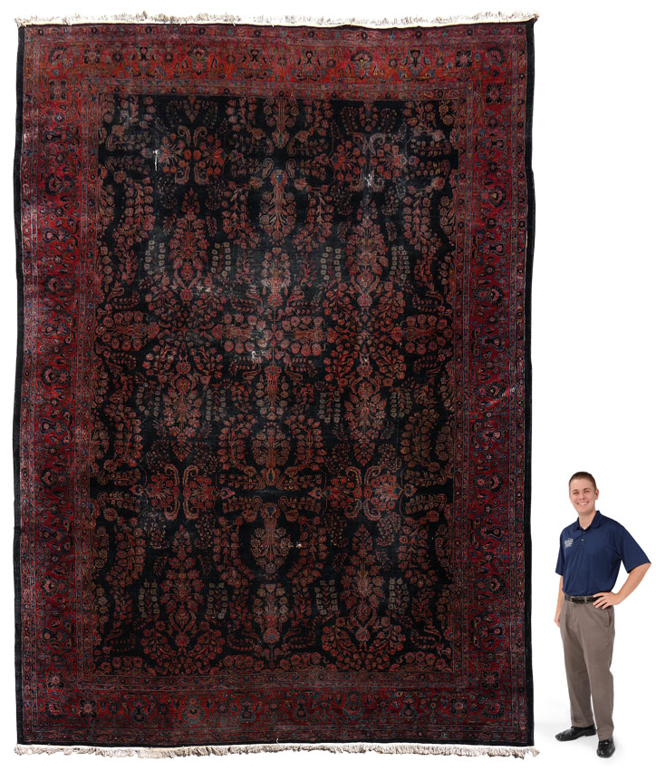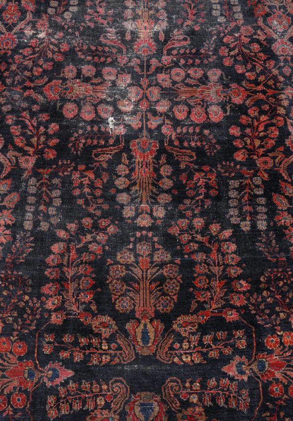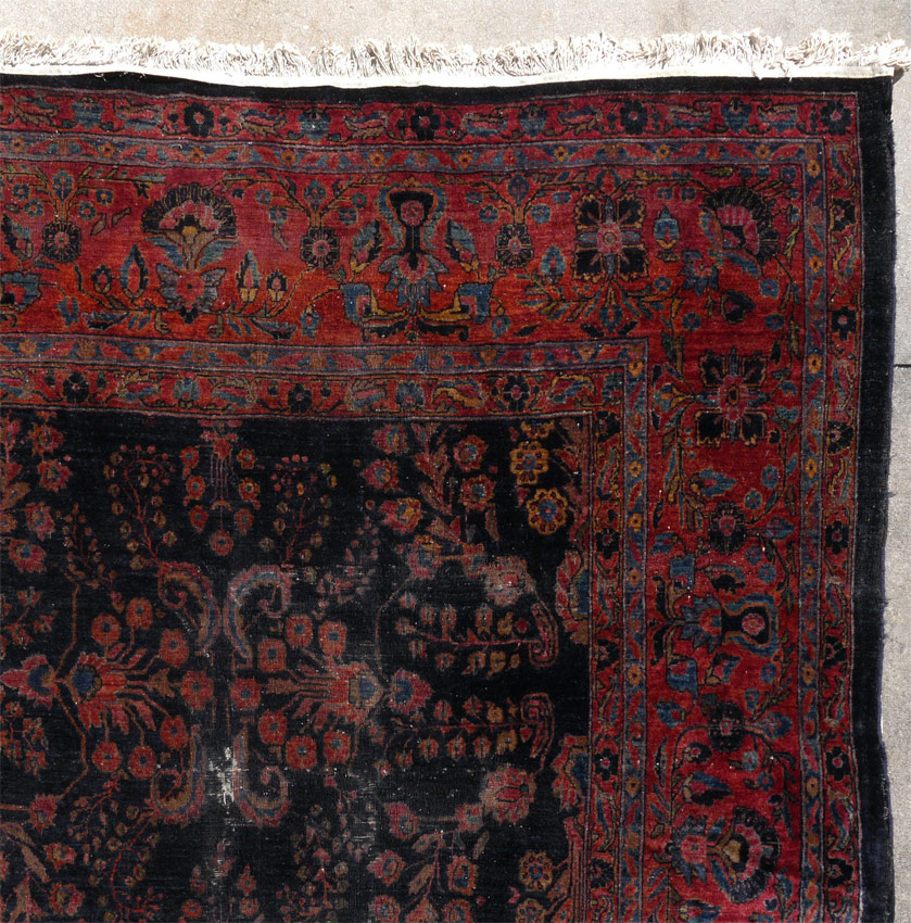 ANTIQUE PERSIAN SAROUK HAND KNOTTED WOOL PALACE SIZE RUG, APPROX. 10' x 17': This very large very old Sarouk has a midnight blue filed which is uncommon in most rugs from this center of weaving. The vast majority of Sarouks have a red field. The field is covered with the typical motifs found in Sarouks, the large sprays of flowers of different types fill in the field. The large main border has the red ground usually found as the main color of the rug.
