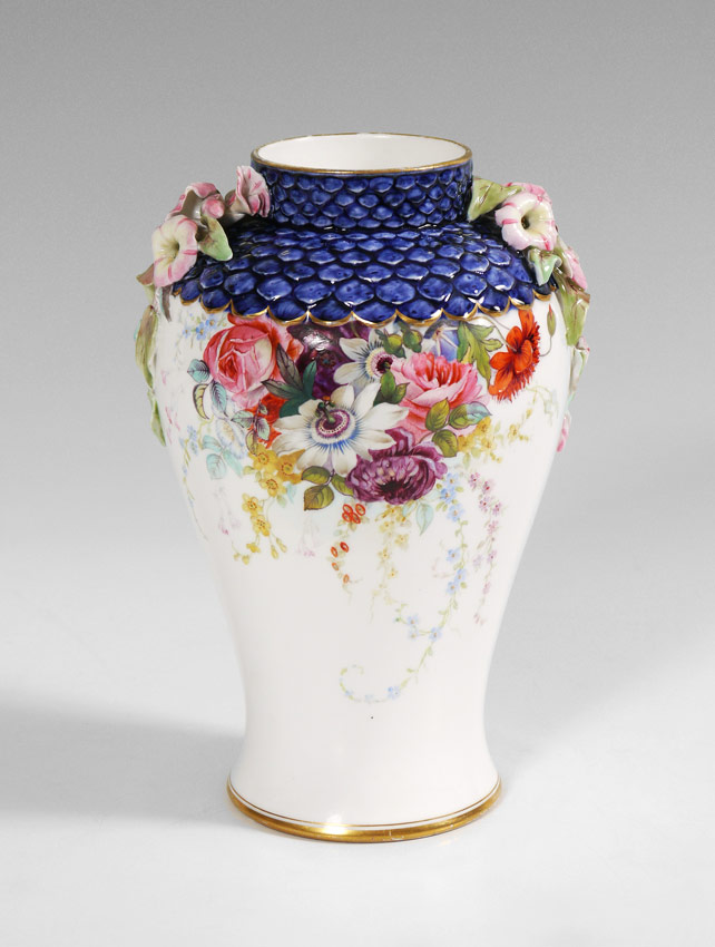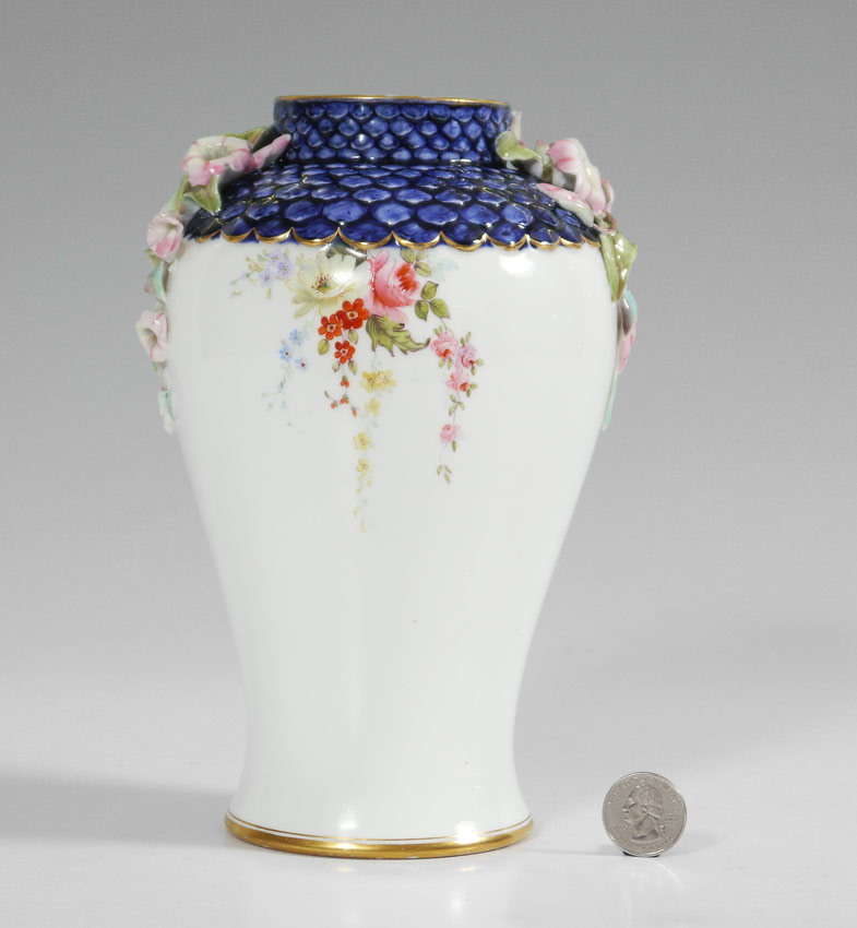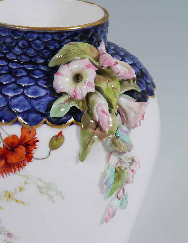 ROYAL WORCESTER HAND PAINTED VASE: Ca. 1899. Hand painted floral decoration with applied Morning Glory handles. Well marked with Registration number 351292 and Royal Worcester mark. 8.5'' tall.