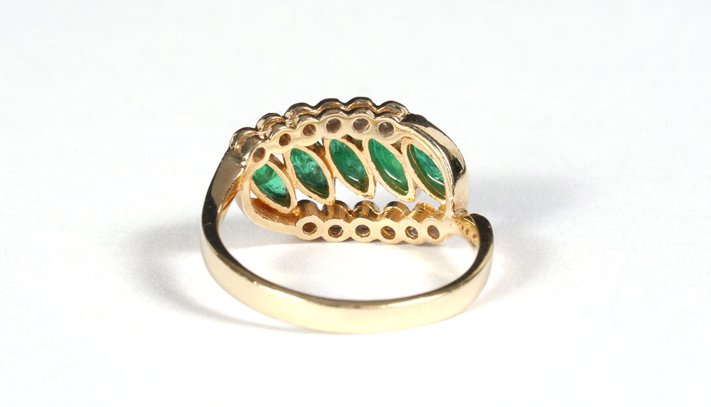 MARQUISE EMERALDS WITH DIAMONDS RING: 14K yellow gold ring features 5 marquise cut emeralds totaling approx. 1 Ct., rated SI in clarity (Type III), G in Hue, 4 in Tone and 3-4 in Saturation. 12 round cut diamonds totaling approx. .25 Ct. average SI-I1 in clarity and J-K-L in color. Size 6.5, weight 4.1 grams.