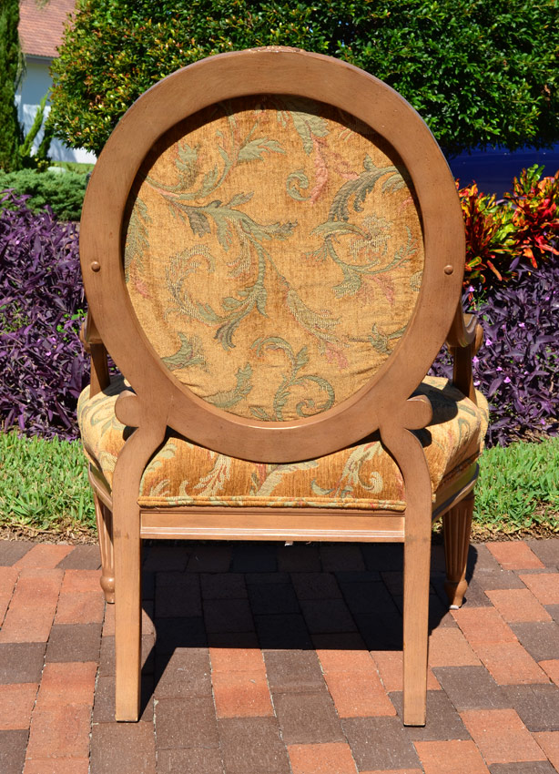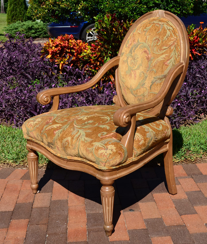 BERNHARDT CARVED ARM CHAIR: Carved and shaped frame, textured foliate scroll upholstery. 42 1/2'' h. x 32 1/2'' x 31''.