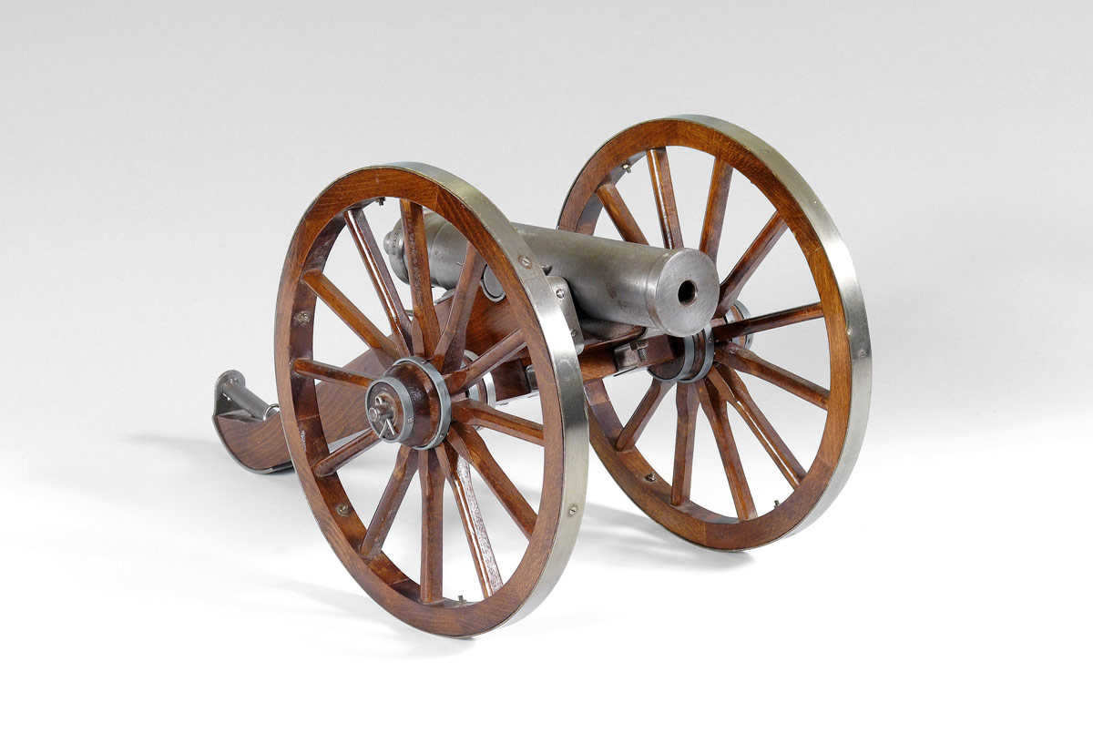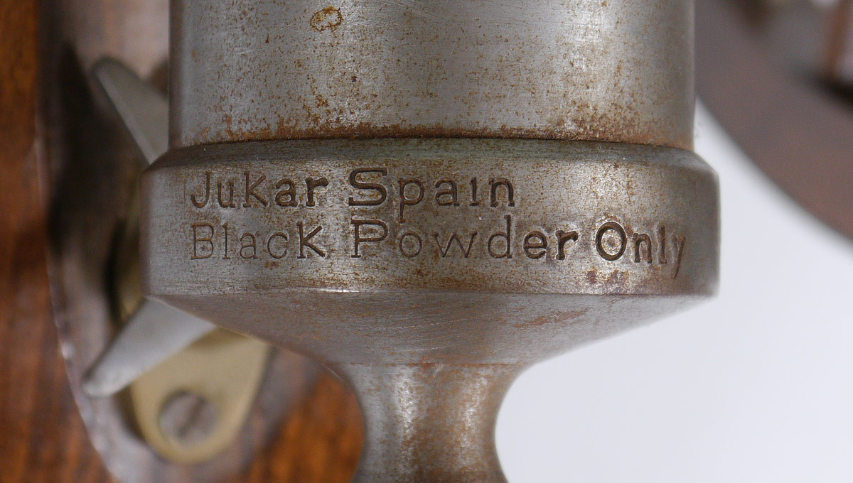 JUKAR BLACK POWDER SIGNAL CANNON: 10'' cast metal barrel marked ''Jukar Spain, Black Powder Only''. Wood caisson with metal wrapped wheels. Overall measures 11 3/4'' x 21 3/4'' x 13''.
