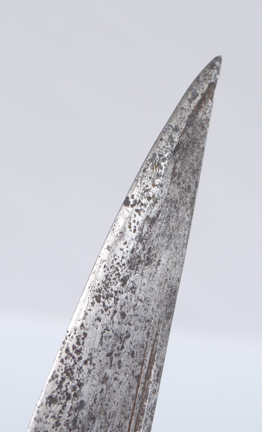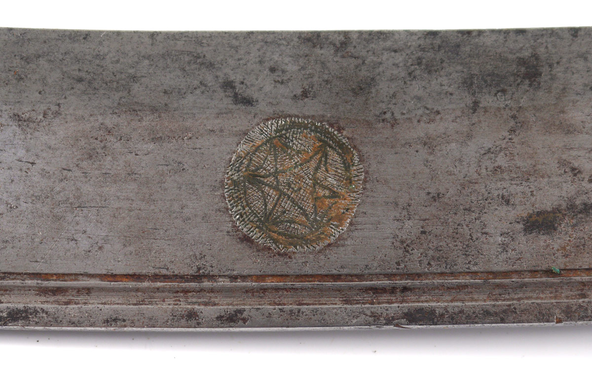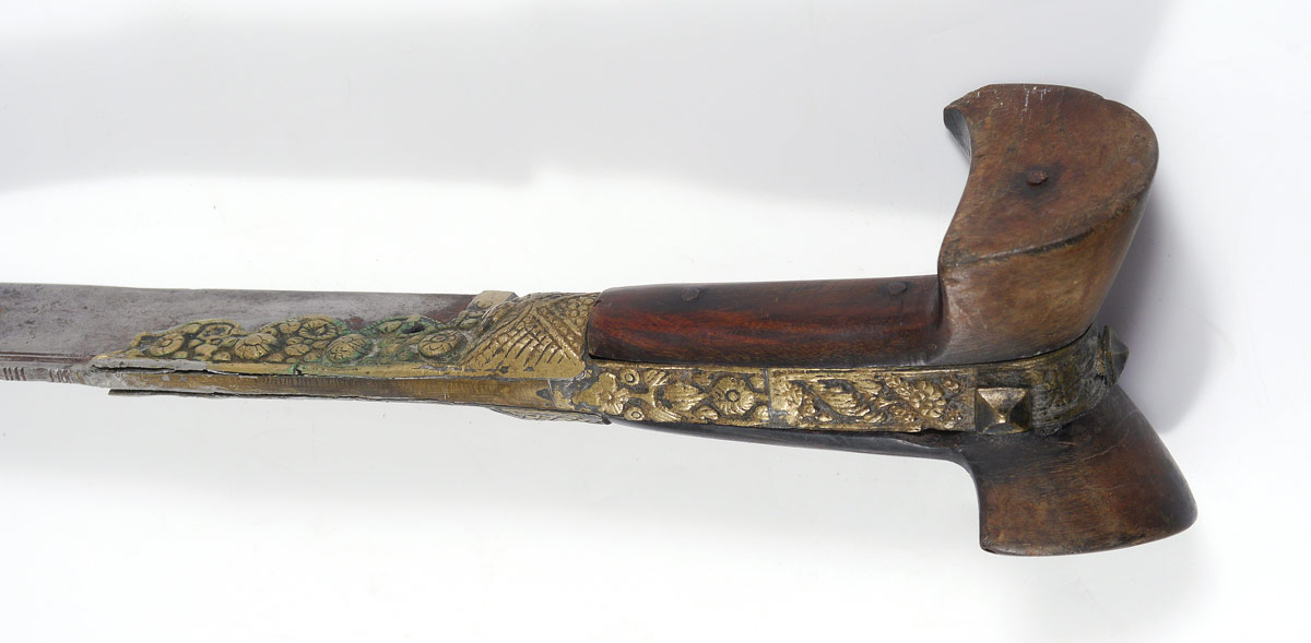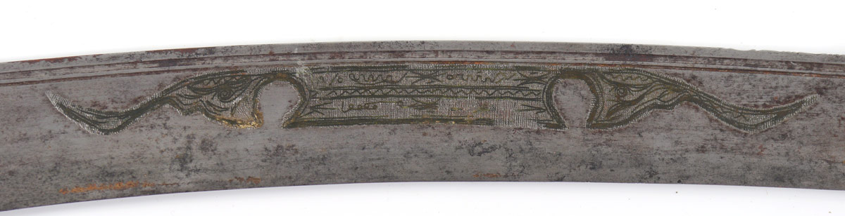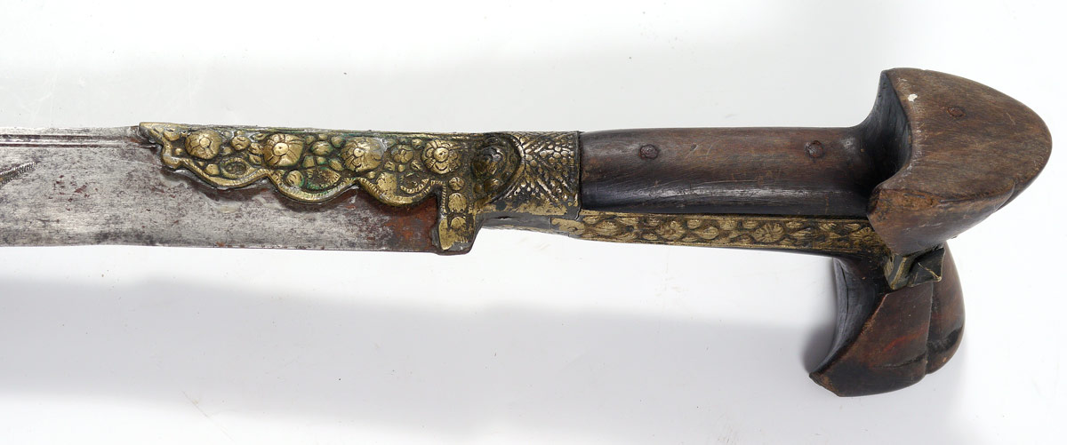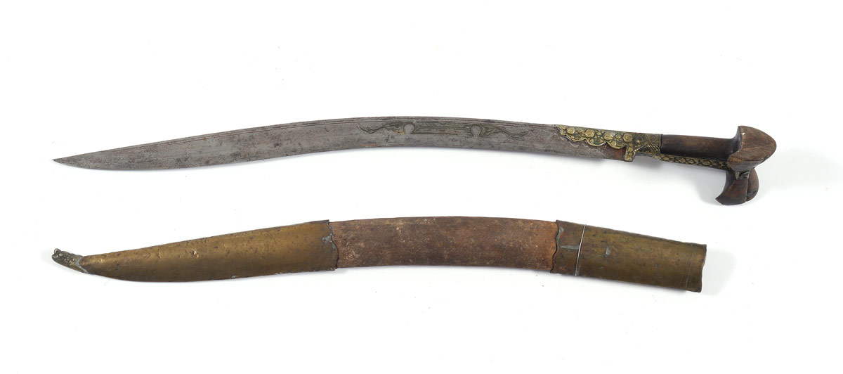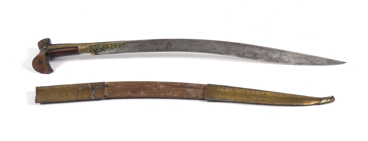 TURKISH / OTTOMAN YATAGHAN SWORD: 19th century carved handle with brass decoration extending to blade. 26'' curved blade with applied decoration. Wood scabbard, brass mounts with stippled designs. Overall measures 34 3/4'' long.