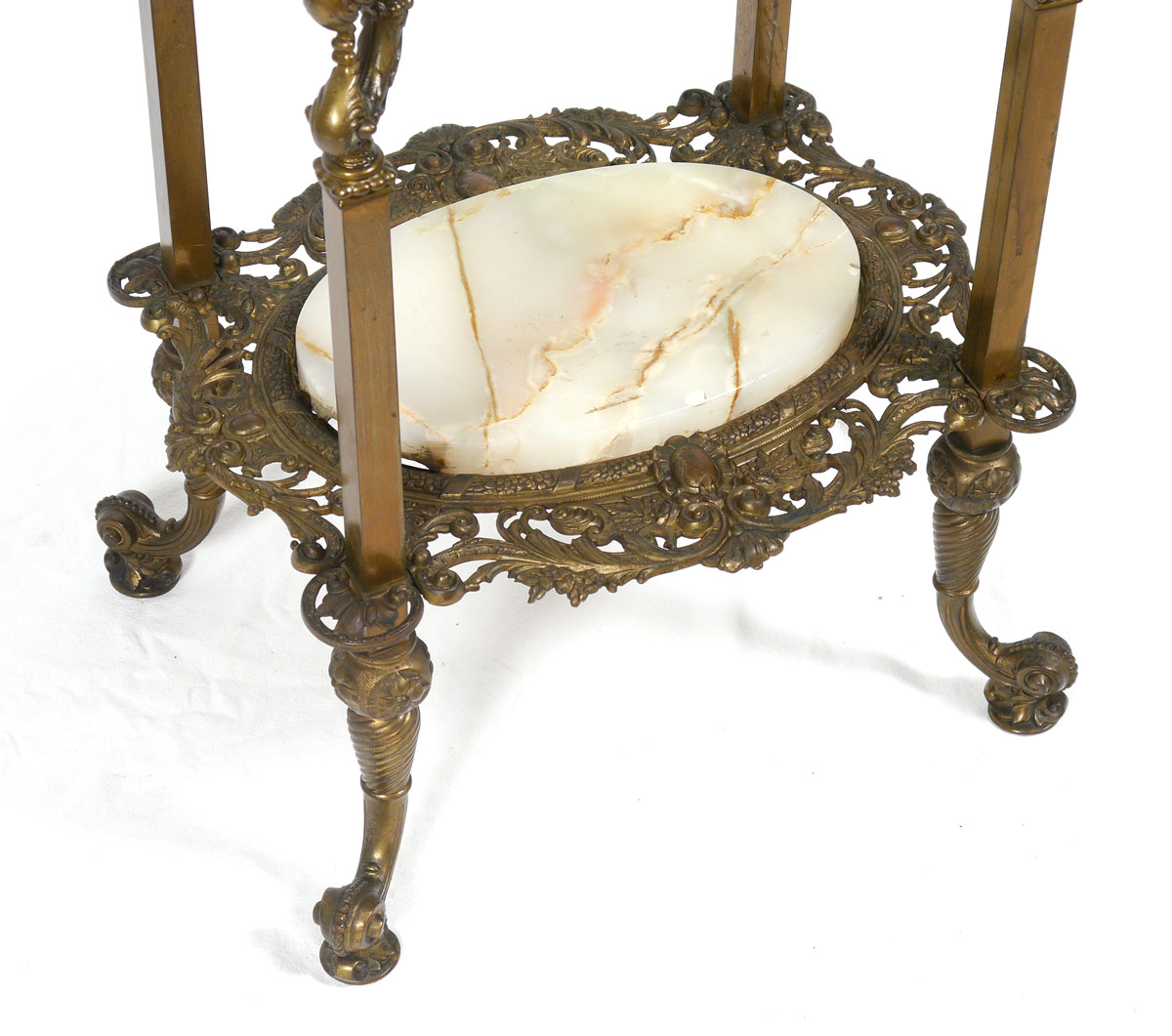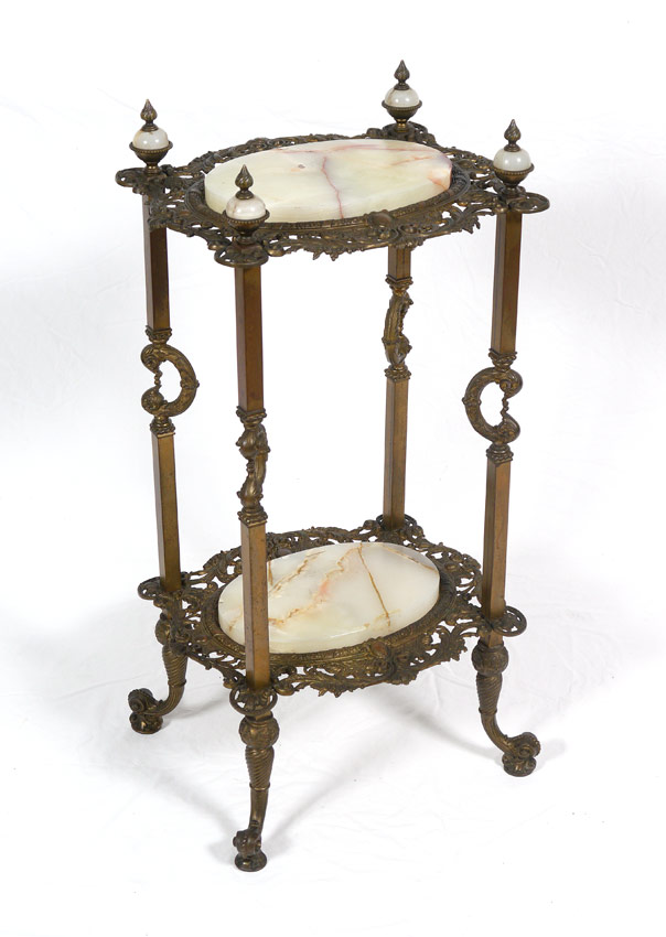 2 TIER ONYX & BRASS STAND: Ornate stand with cast metal foliate scroll motif frame. Inset Onyx shelf on each tier, onyx and flame finials. Overall 36'' h. x 18'' x 15 1/4''.