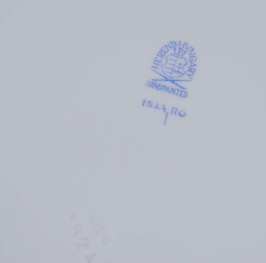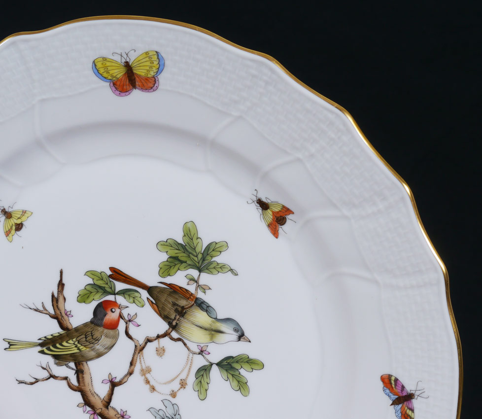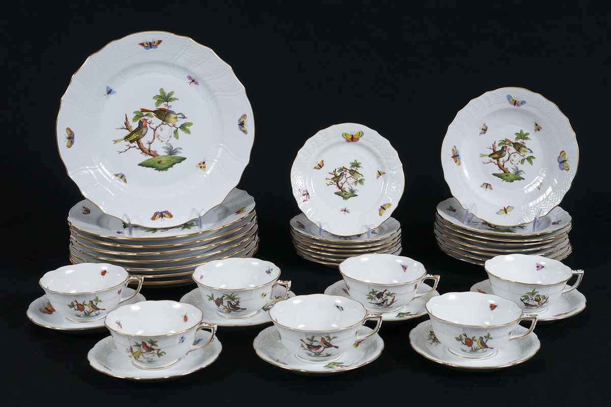 HEREND ROTHSCHILD BIRD FINE HAND PAINTED CHINA: 38 pieces to include 8 dinner plates 1524 (10''), 8 salad plates 1518 (7 1/4''), 7 bread plates 1518 (6''), 8 footed cups 734 (4 1/8'' dia.), and 7 saucers 734 (5 3/4'').