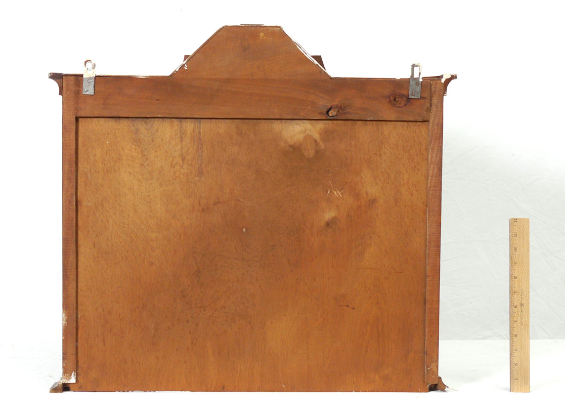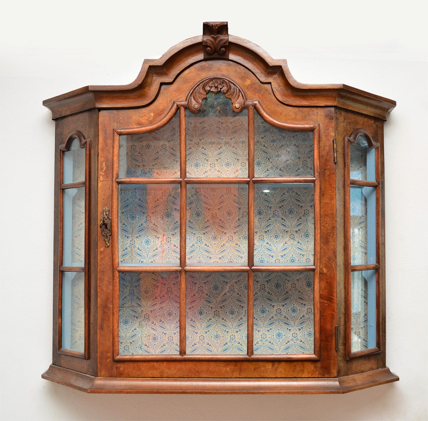 HANGING DUTCH WALL CUPBOARD: Shaped pediment with applied carved decoration. 9 light front door with 3 light side windows. Wallpaper back interior with 2 shaped shelves. 26 1/4'' x 27 1/4'' x 8''.