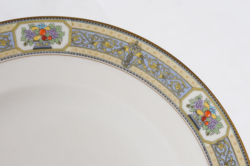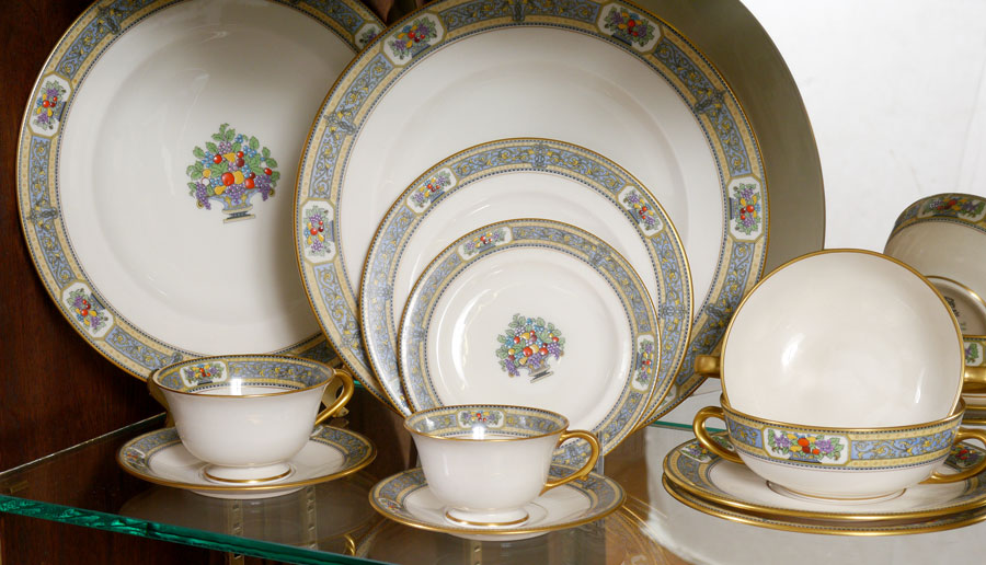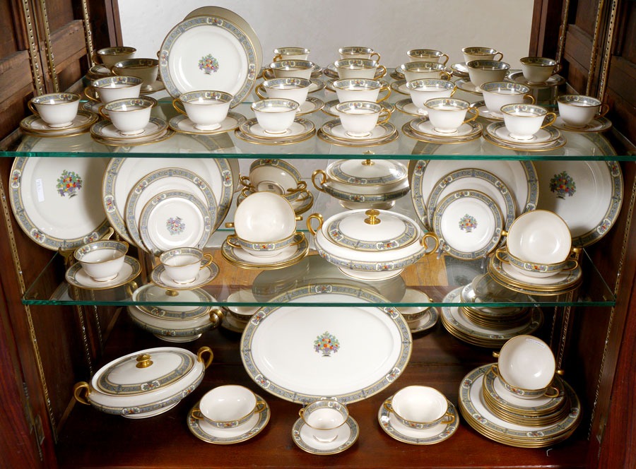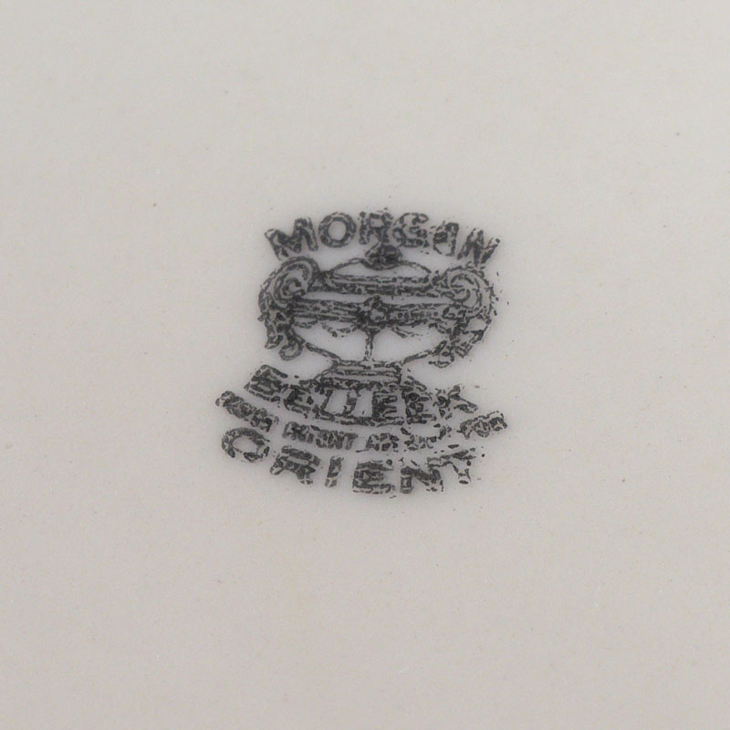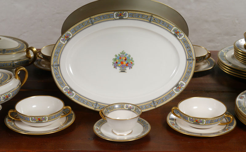 MORGAN BELLEEK ORIENT PATTERN CHINA SERVICE: 83 pieces to include 8 each of dinner plates (10 1/2''), salad plates (7 1/4''), bread plates (5 1/2''), cream soups with saucers, cups with saucers, and demi-tasse cups with saucers. Serving pieces are the round covered vegetable, oval covered vegetable and 15'' platter. Ca. 1924-1929.