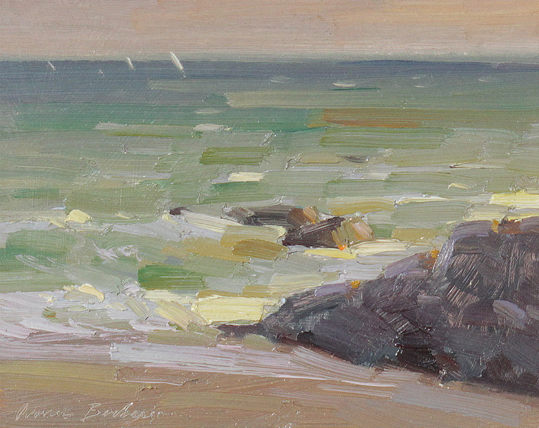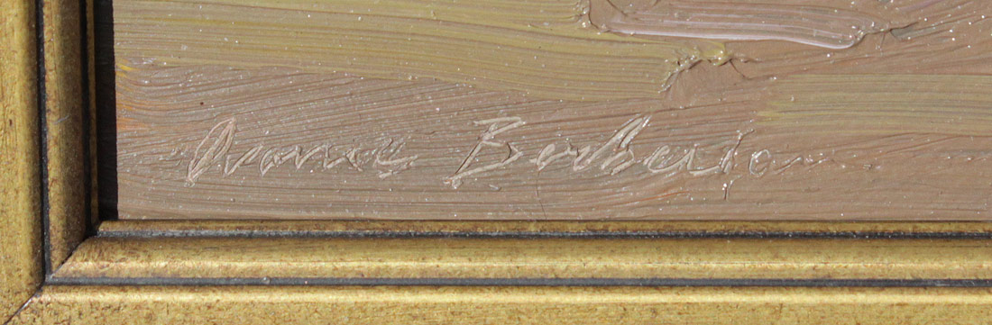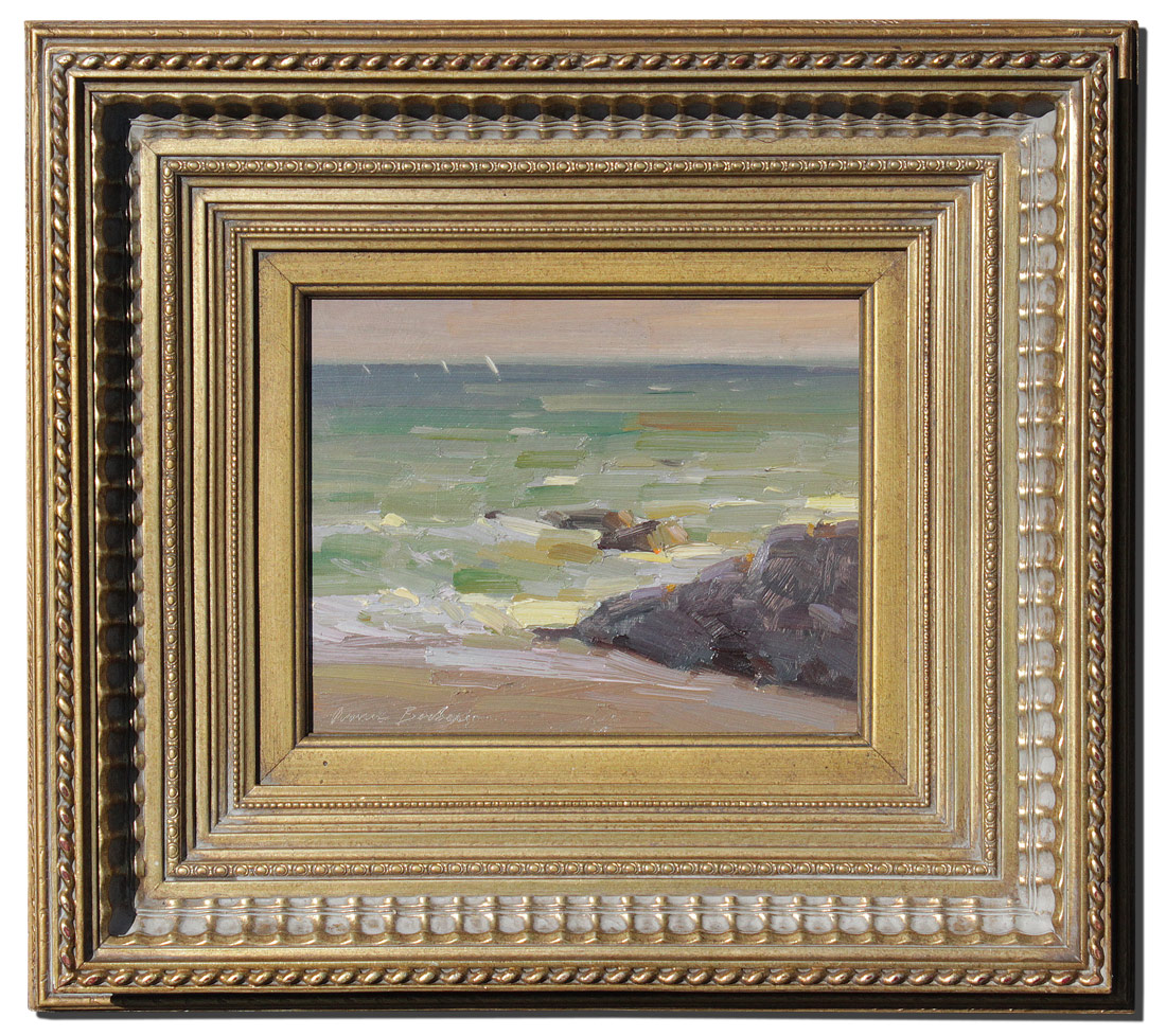 BERBERIAN, Ovanes, (American, 1951- ): Coastal Scene with Shoreline and Sailboats, Oil/Masonite, 8'' x 10'', incised signature lower left, heavy gilded gesso molding 17 1/4'' x 19 1/4''.