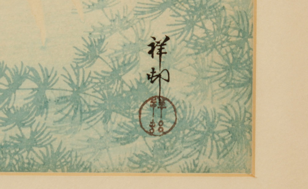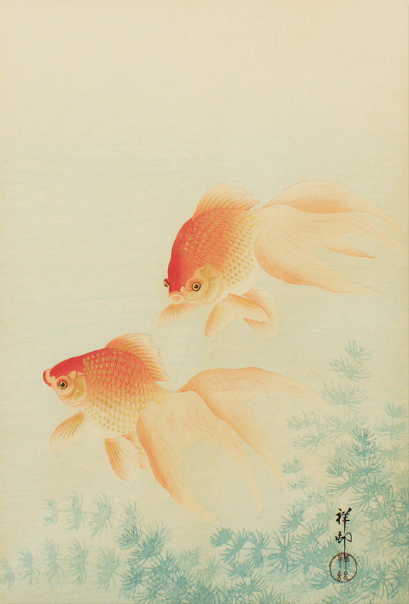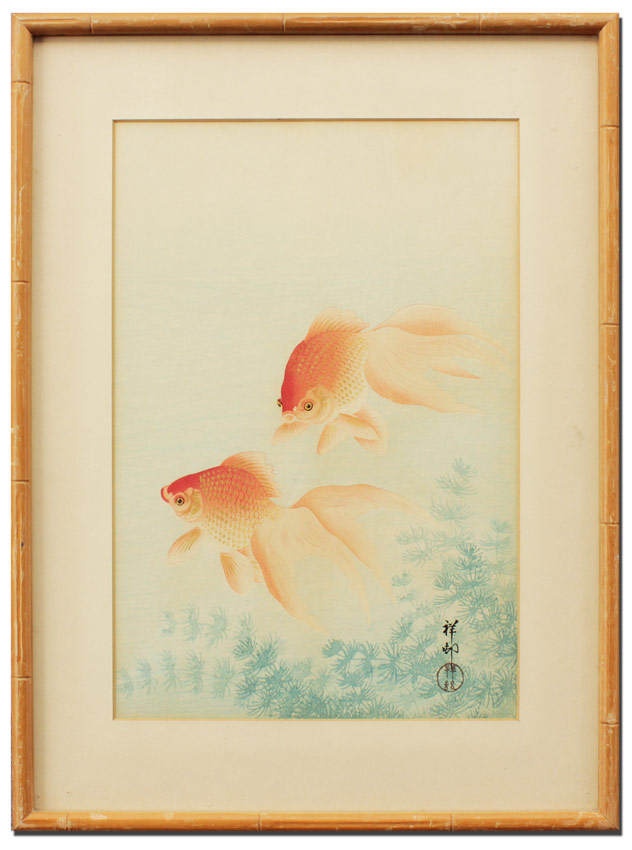 KOSON, Ohara, (Japanese, 1877-1945): Two Goldfish, Color Woodblock Print, Sight size 13 1/4'' x 9 1/4'', chop mark lower right, encased in original faux bamboo frame with wear 18 1/4'' x 14''.