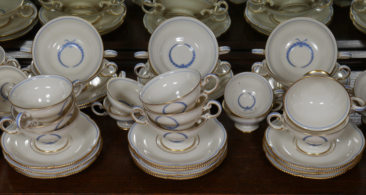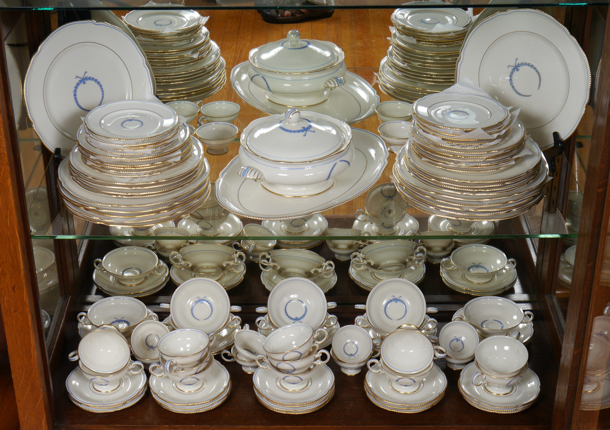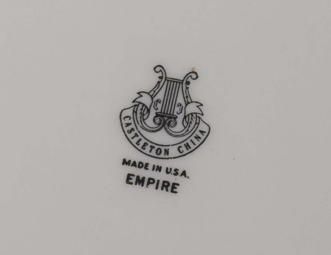 CASTLETON ''EMPIRE'' FINE CHINA: Approx. 102 pieces to include 12 Dinner Plates (10 1/2''), 8 Luncheon Plates, 12 salad plates, 11 Bread plates, 8 cream soup with 9 underplates, 12 cups, 16 saucers, 12 demi cups, covered vegetable and the 16'' Platter.