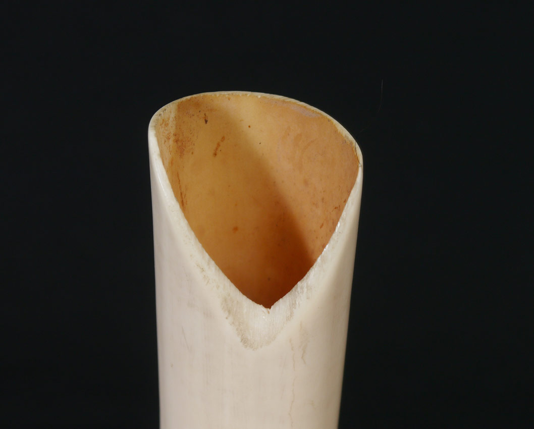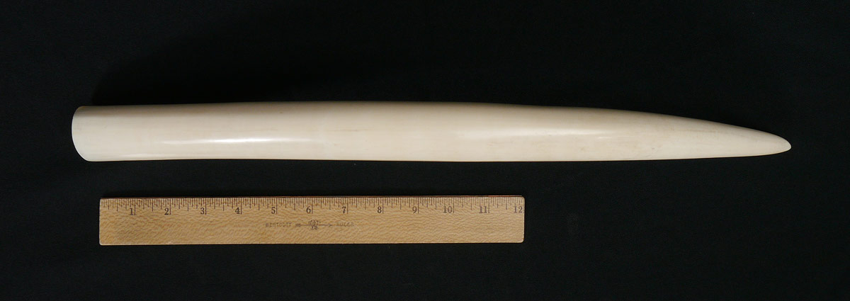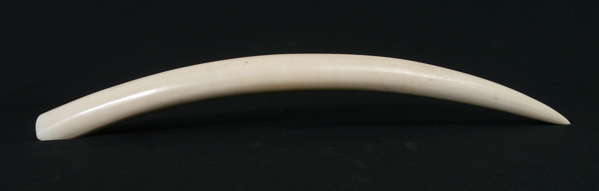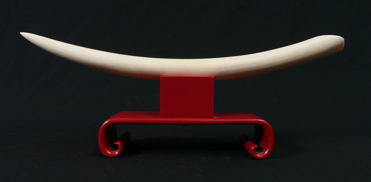 IVORY TUSK WITH STAND: Smooth, uncarved tusk, 20 1/4''. Sold with red painted stand. 4 7/8'' x 10 1/2'' x 4''. Tusk weighs 1.7 lbs.
