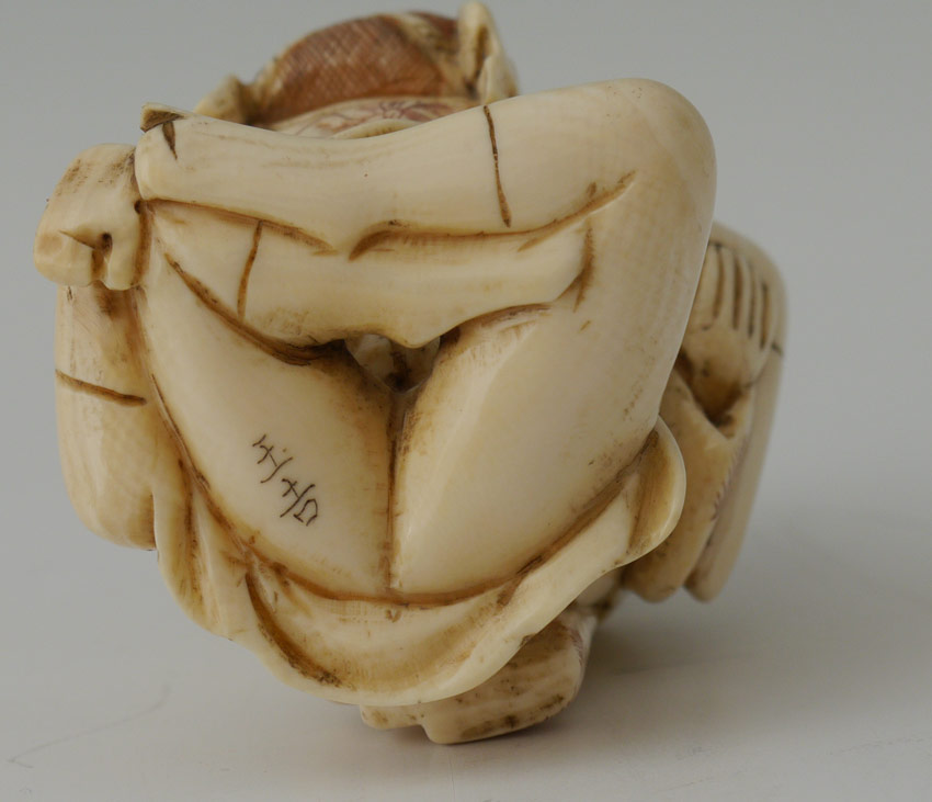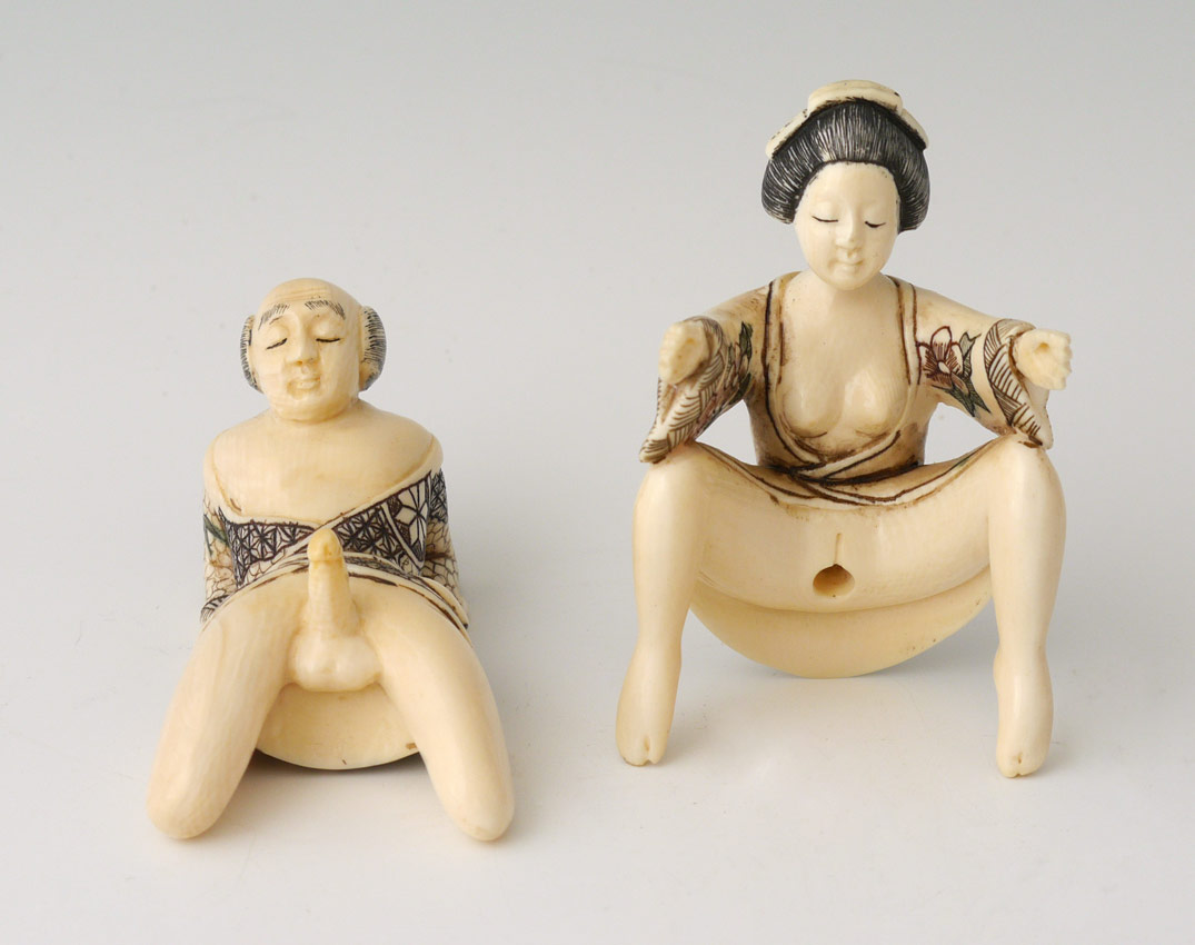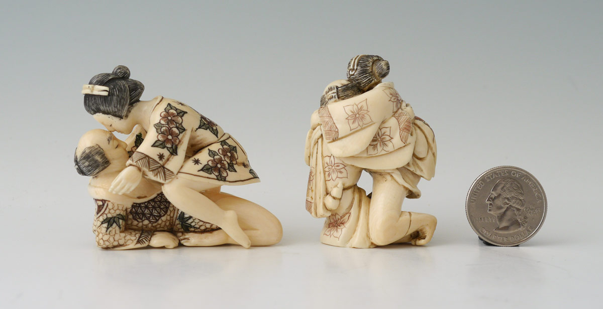 2 CARVED IVORY OKIMONO EROTIC FIGURAL GROUPS: 20th century, to include 1) Removable woman atop a man. Unsigned, overall 2'' h. x 2 1/2''. 2) Affixed seated woman on man, signed on base, 2 1/2'' h..