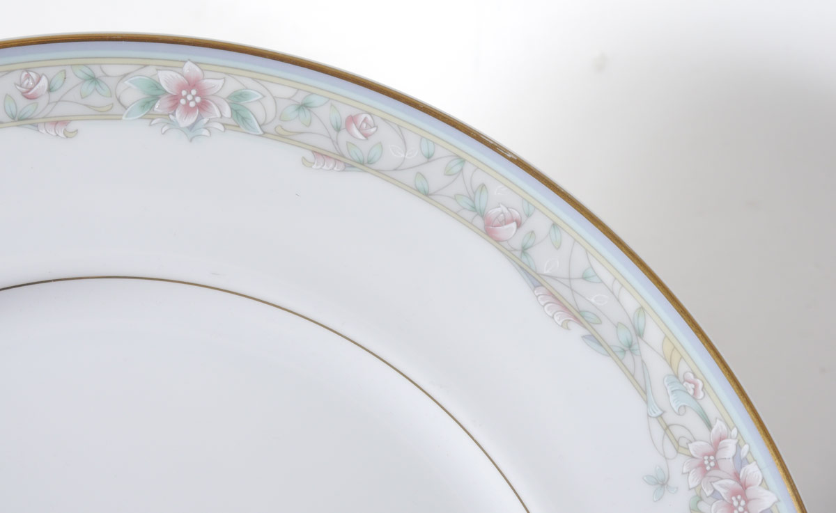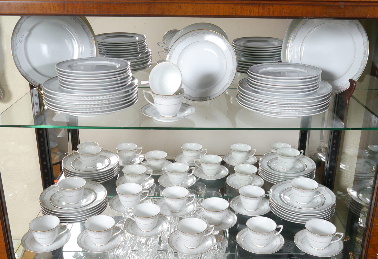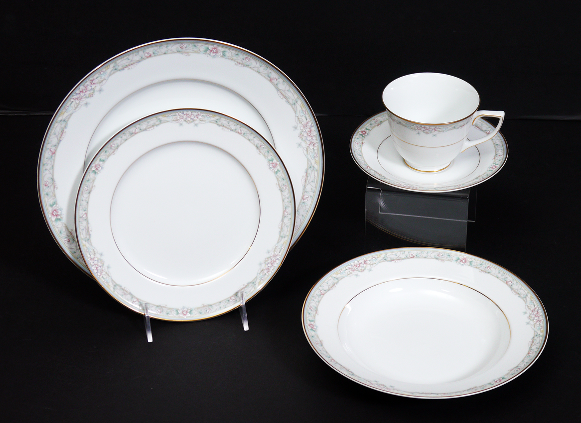 MIKASA FINE CHINA IN THE MORNAY PATTERN: Approx. 67 pieces to include 14 dinner plates (10 3/4''), 13 salad plates, 13 soup bowls, 14 cups and 12 saucers.