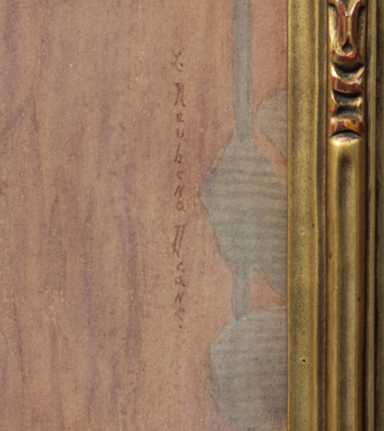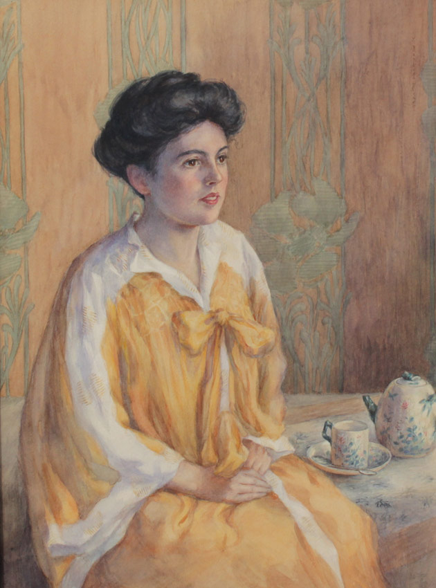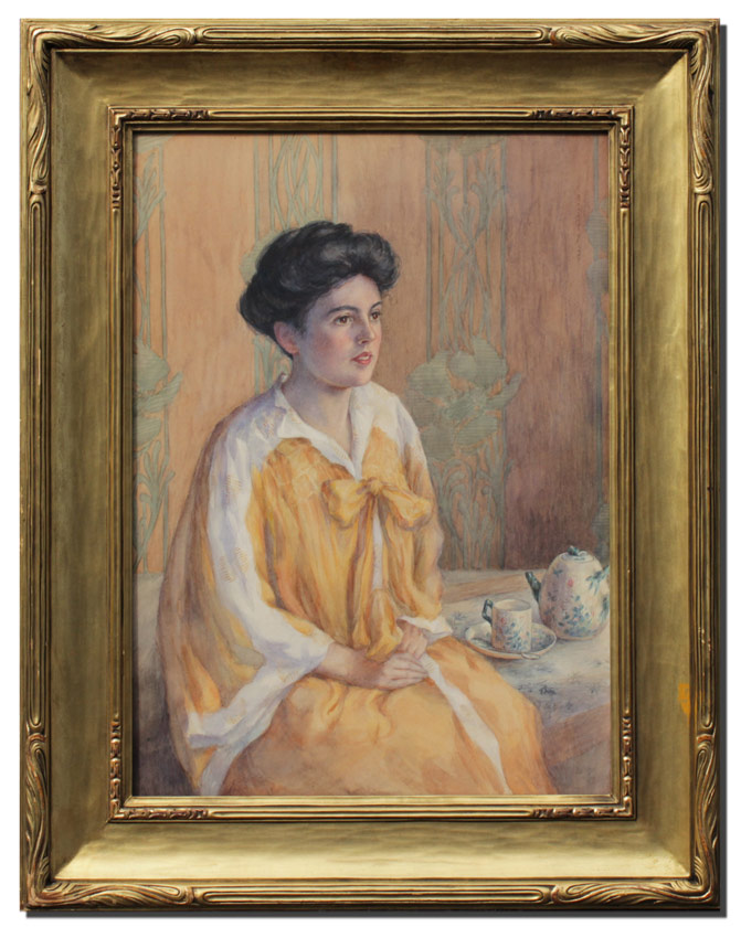 DEANE, Lillian Reubena, (American, 1881-1972): Portrait of a Seated Young Beauty in an Interior with a Strong Art Nouveau Style, Watercolor, Sight size 22'' x 16'', signed upper right, encased in period carved and gilded Newcomb Macklin frame with minor wear 29 1/2'' x 23 1/2''.
