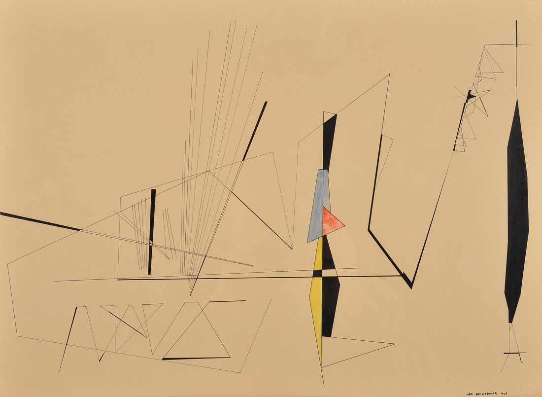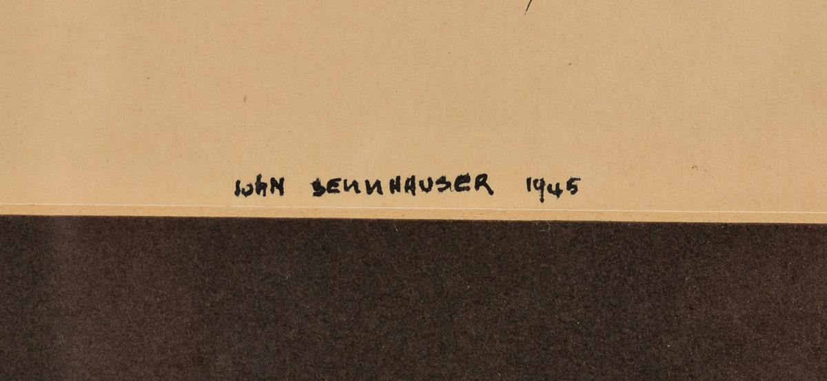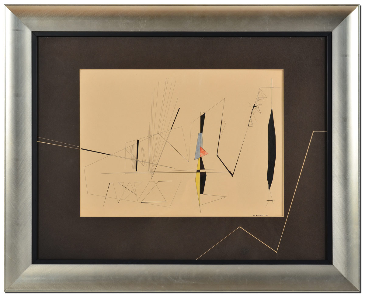 SENNHAUSER, John, (American, 1907-1978): Abstract Geometric Composition, Watercolor, Sight size 13 3/4'' x 19'', signed lower right, dated 1945, custom mating and contemporary silver gilt frame 27'' x 33 1/4''.