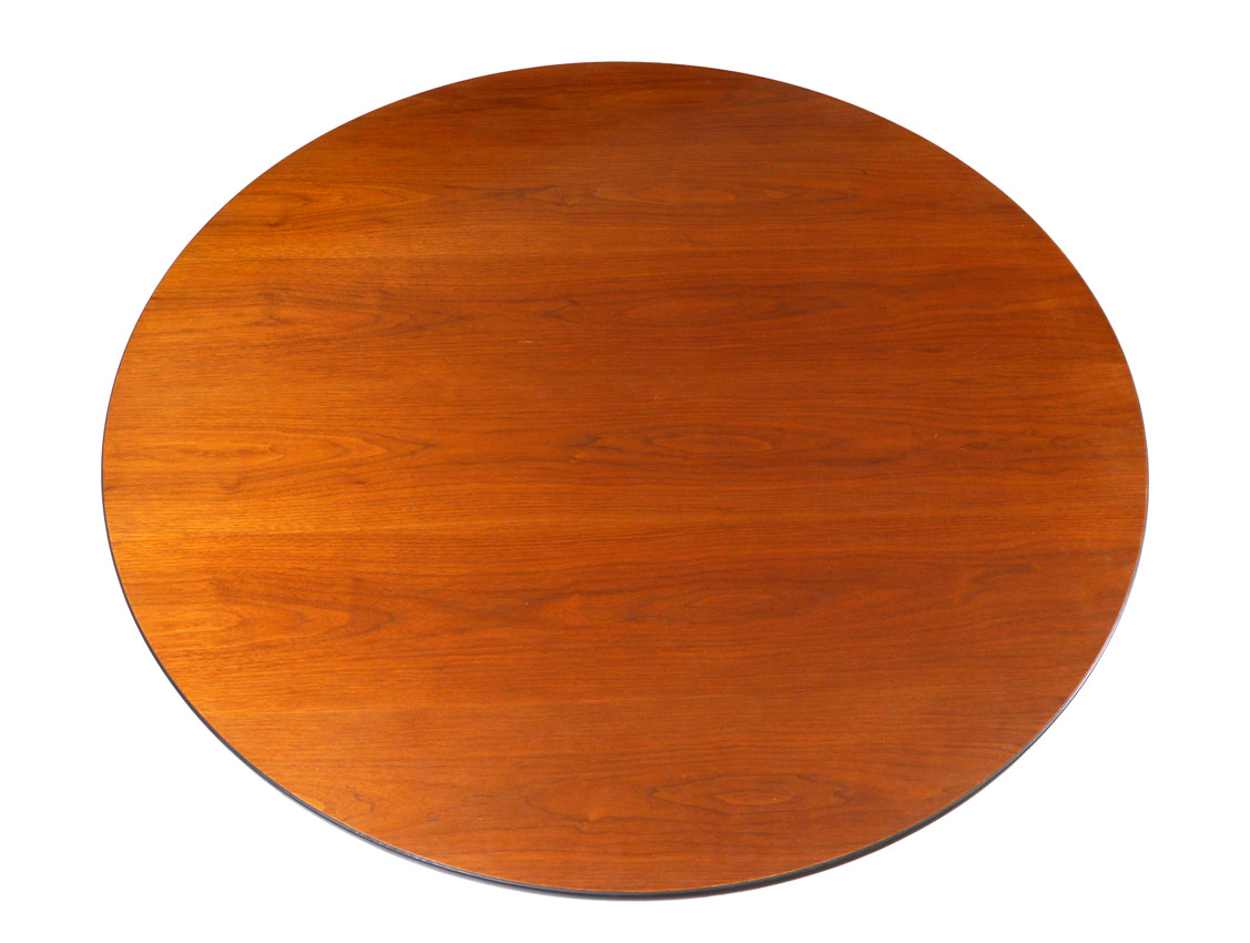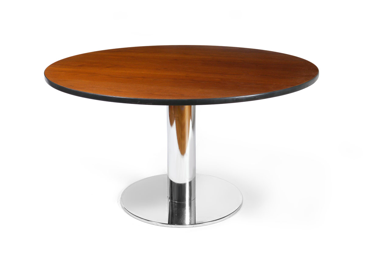 HERMAN MILLER CHROME PEDESTAL BASE TABLE: The white round top edged in black. Herman Miller label. Measures approx. 29 1/2'' high x 54'' dia.