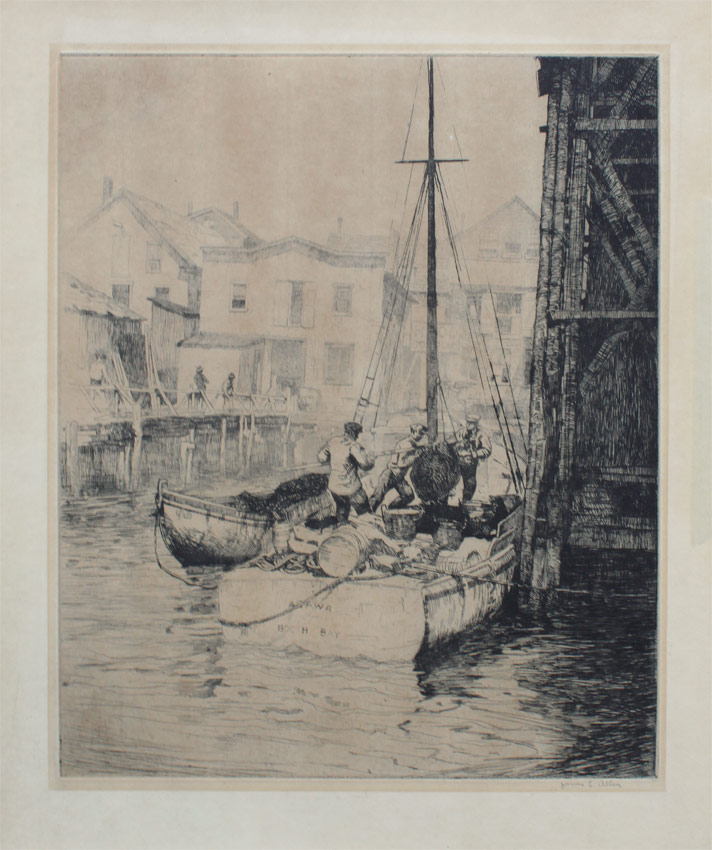 ALLEN, James Edward, (American, 1894-1964): Booth Bay Dockside Scene with Fisherman, Etching, 14'' x 12'' with margins, pencil signed lower right, affixed to cardboard backing, in original black frame 21'' x 16 1/2''.