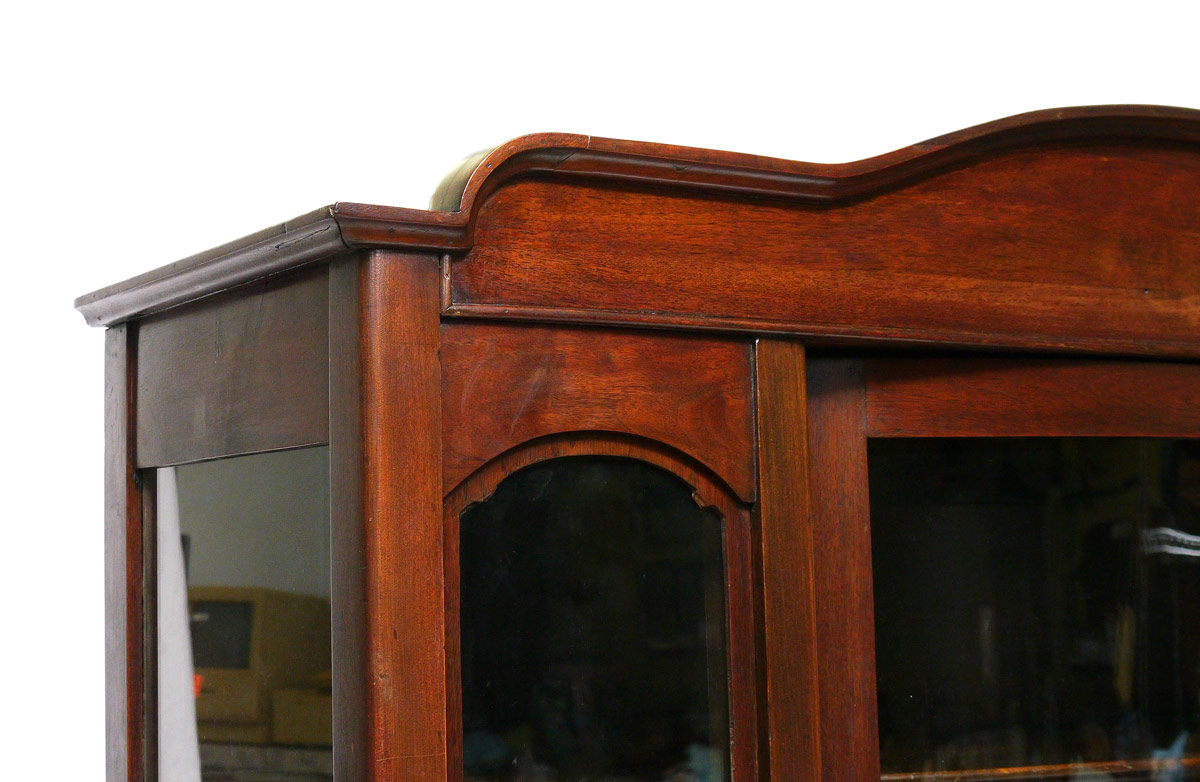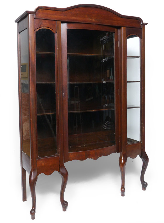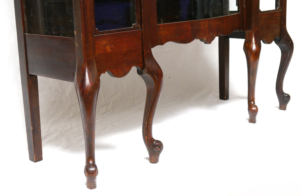 MAHOGANY CHINA DISPLAY CABINET: Shaped crest over curved glass central door with glass sides. 3 wood interior shelves, shaped skirt and front legs. Overall measures 65 1/2'' h. x 48'' x 15 1/2''.