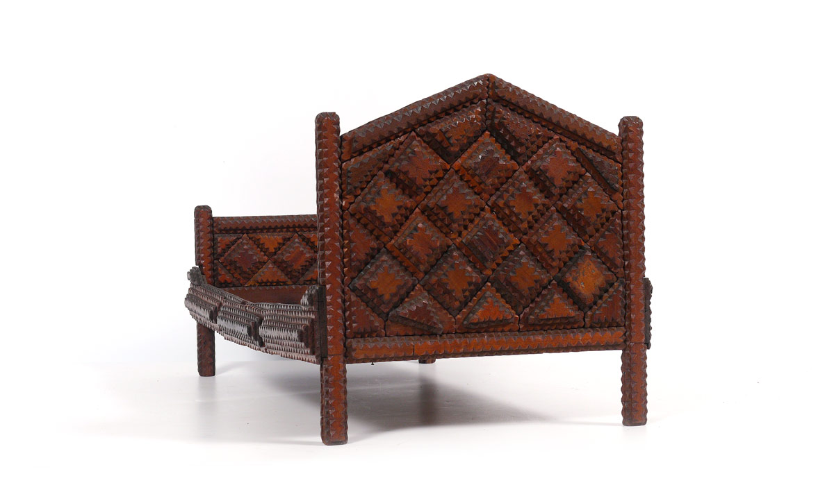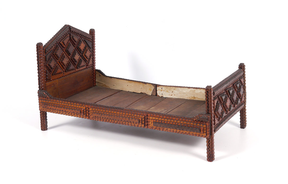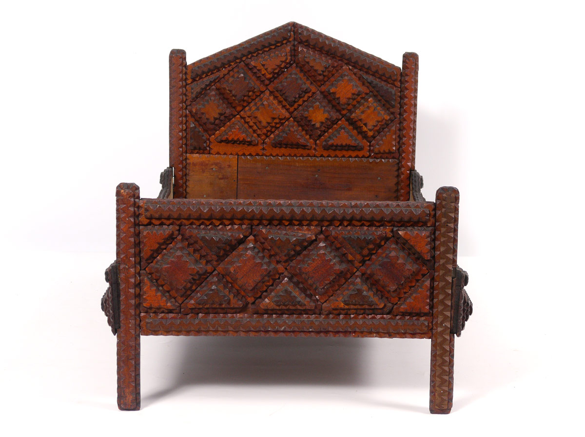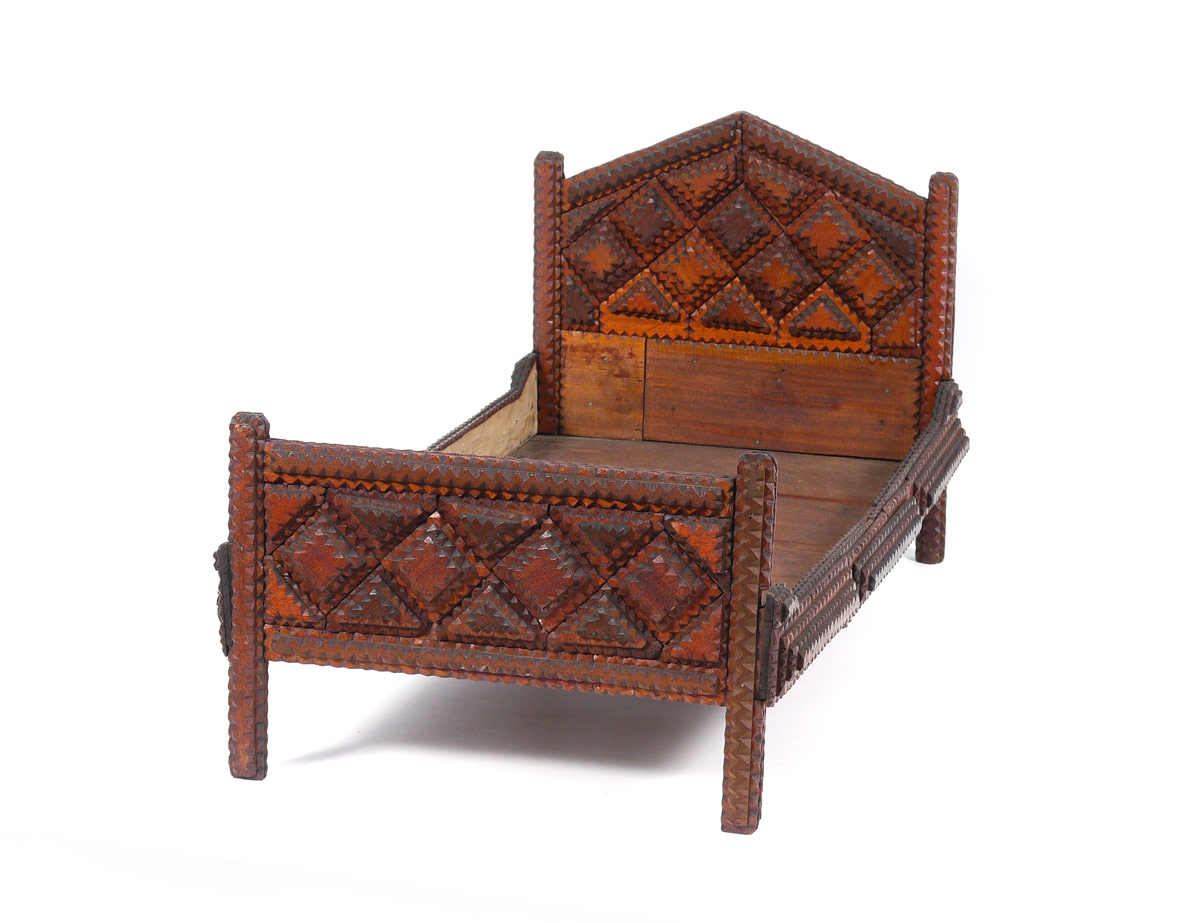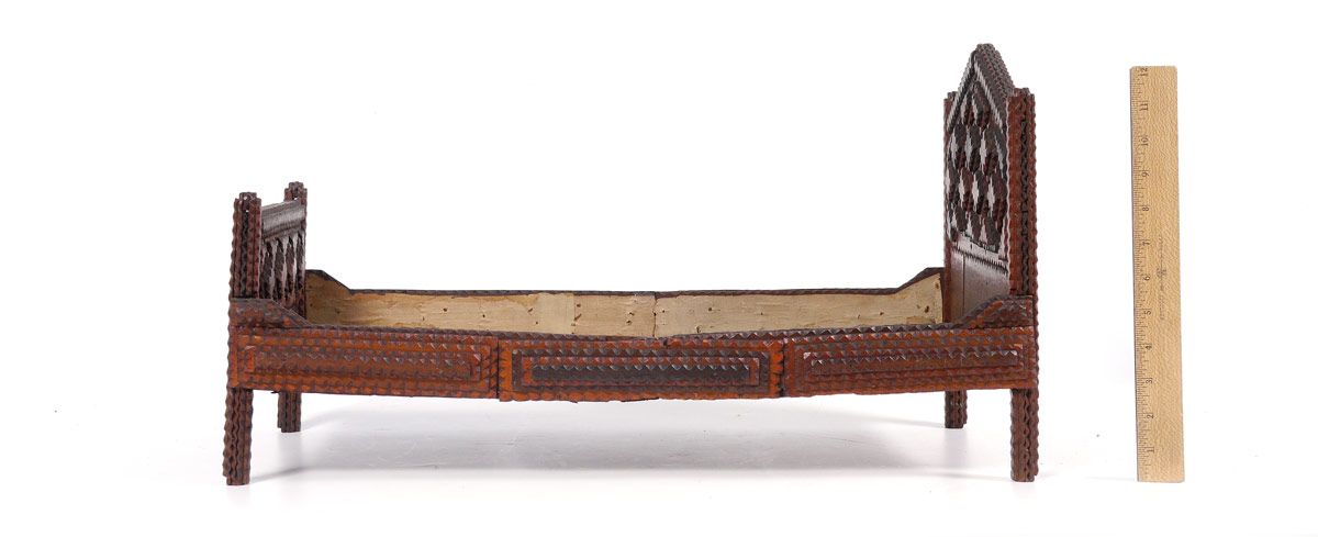 TRAMP ART DOLL BED: Decorated with multi level pyramids on headboard, footboard and rails. Overall measures 13'' x 23 1/4'' x 14''.