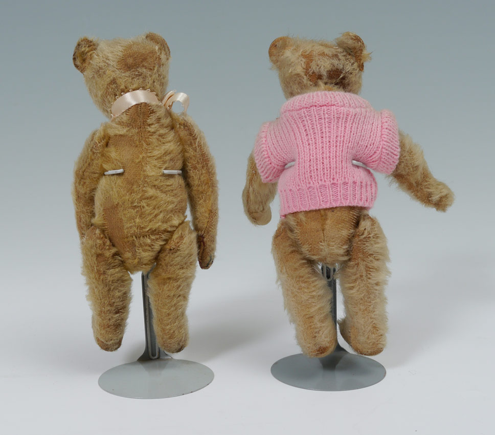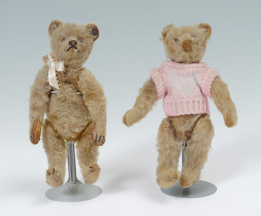TWO 8'' OLD STEIFF TEDDY BEARS: 1) With button still in his ear, head, neck & legs still turn, glass eyes, threaded snout and paws. 2) The indent of his button still shows, but no button, glass eyes, newer sweater.