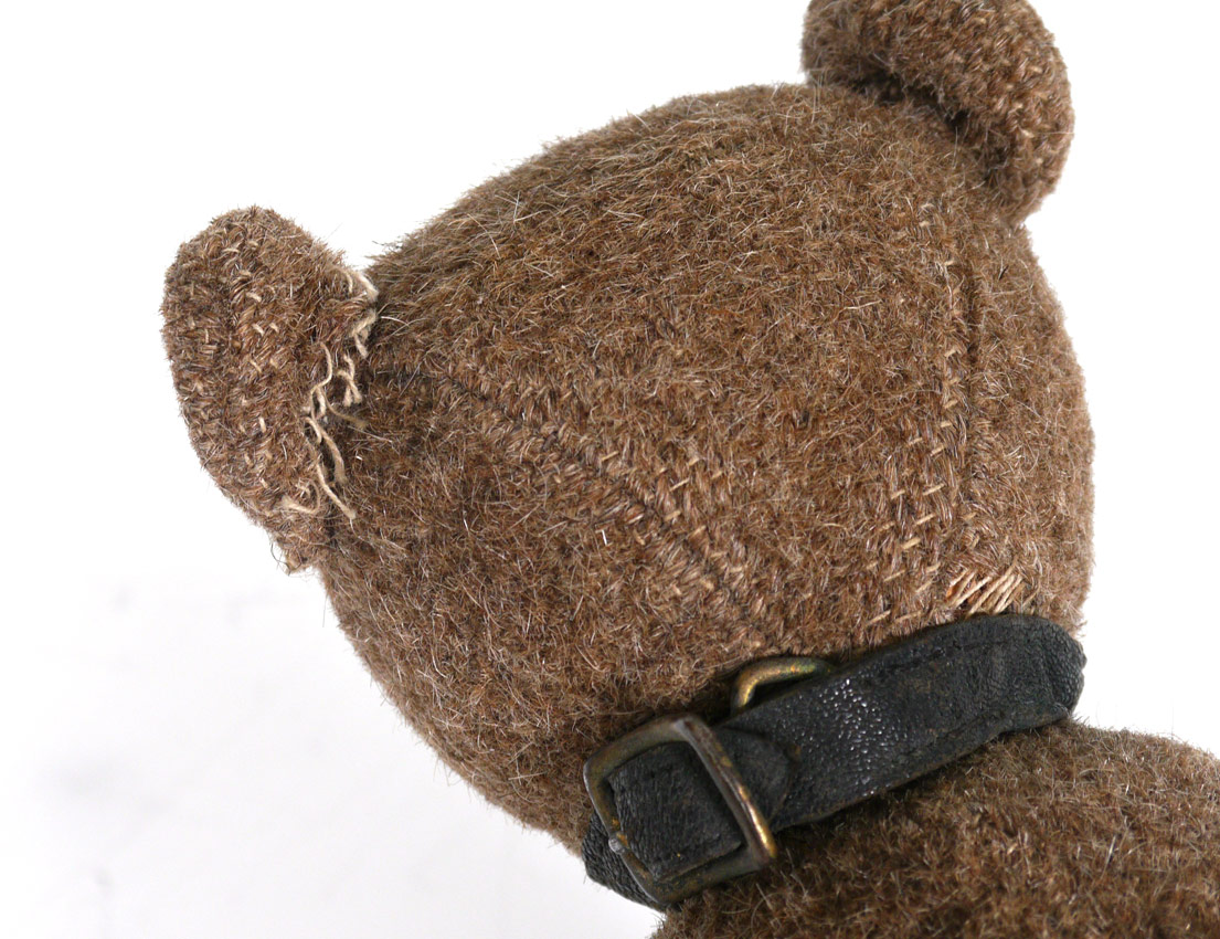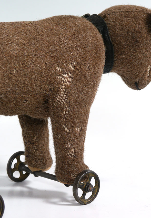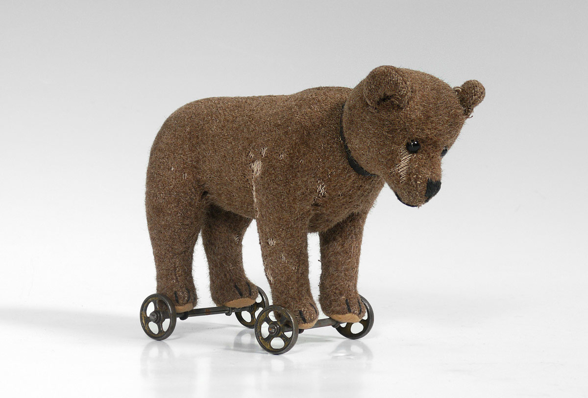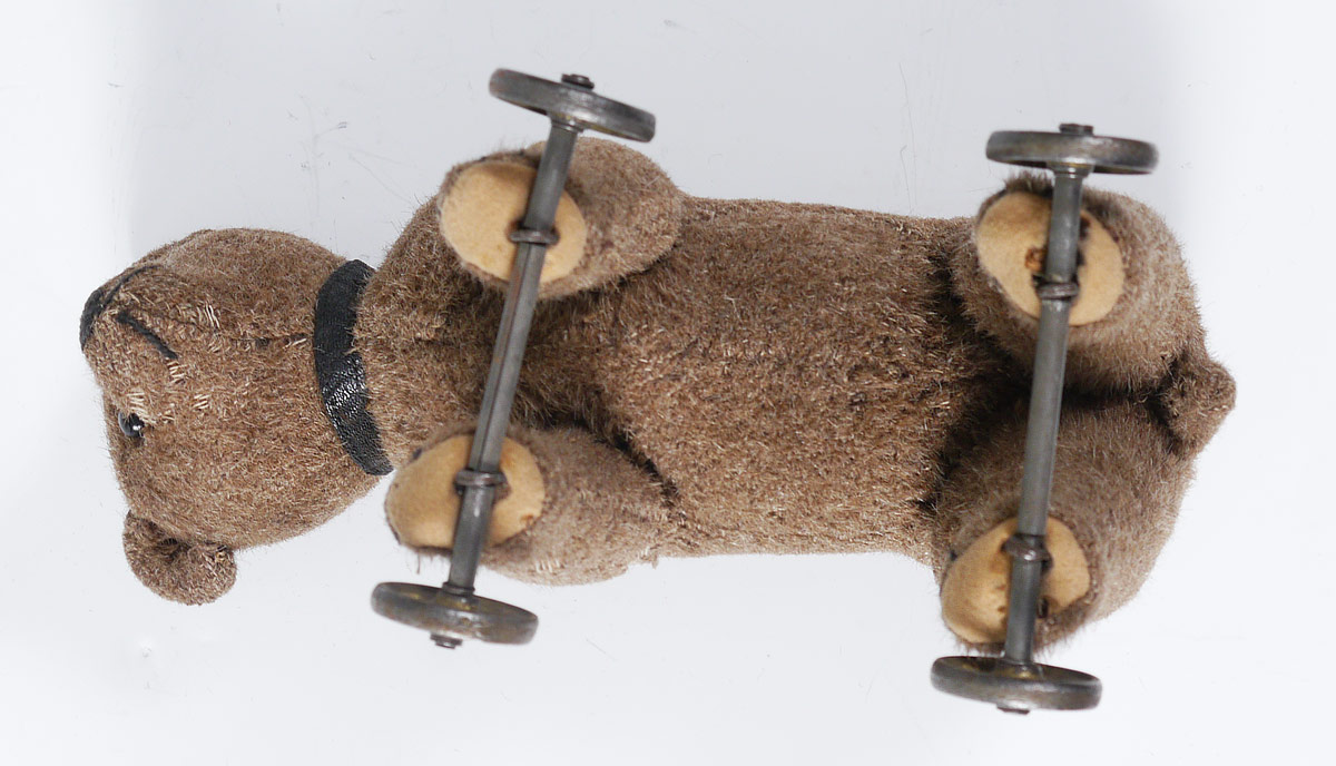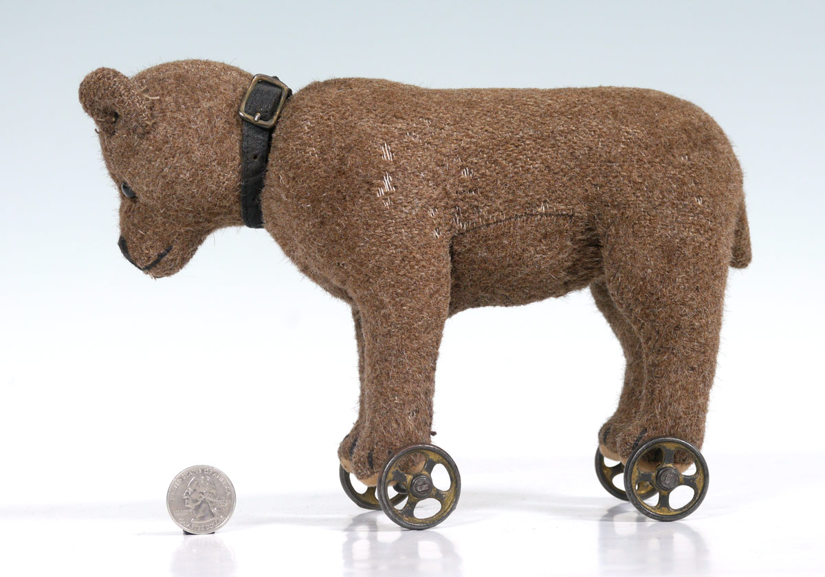 STEIFF BEAR PULL TOY ON WHEELS: Early bear, squeaker, missing button and tag. Leather collar. Measures 6 3/4'' x. 9 1/2'' x 4''.