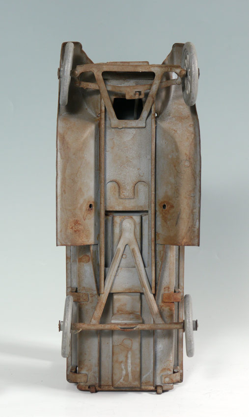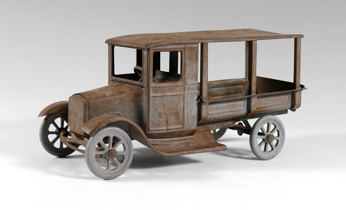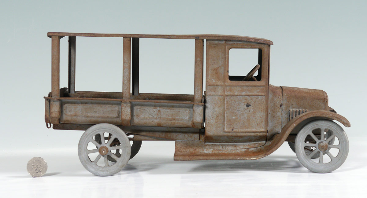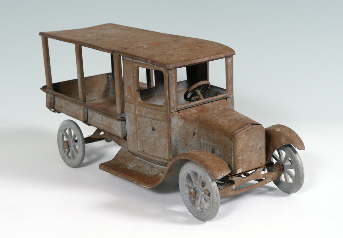 BUDDY L HUCKSTER PRESSED STEEL TRUCK: From the Flivver series, known as the ''Huckster'' Wagon. Ready for restoration, solid body but missing all paint and decals. 6 3/4'' h. x 14 1/4'' x 5 1/2''.