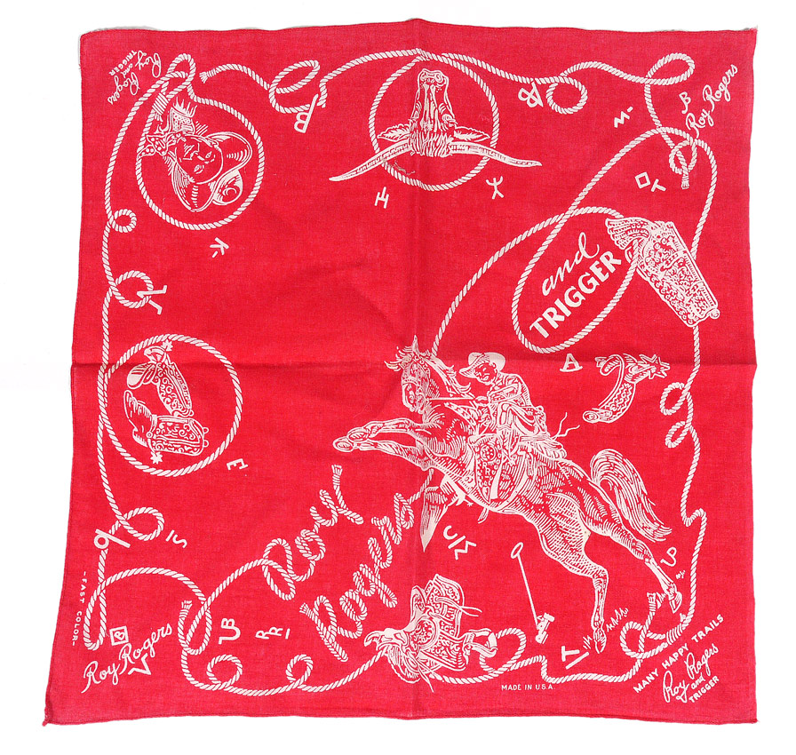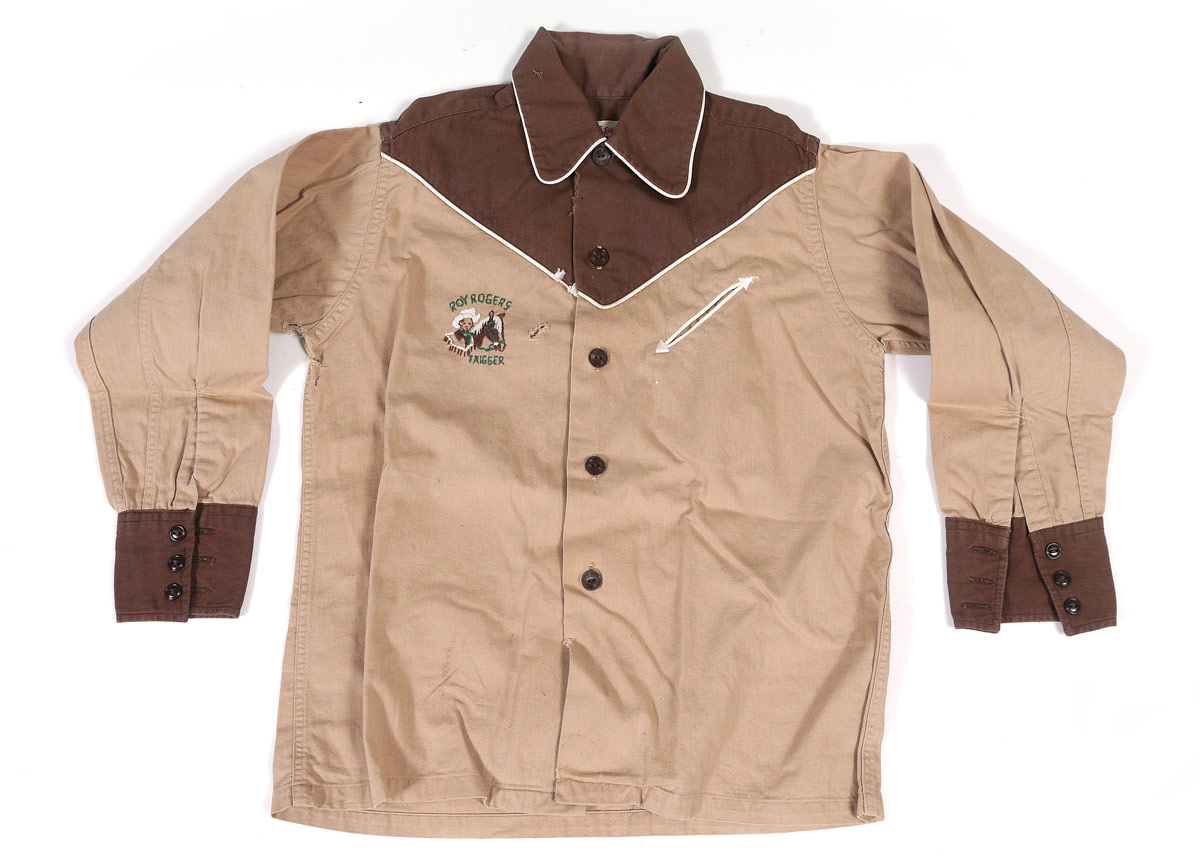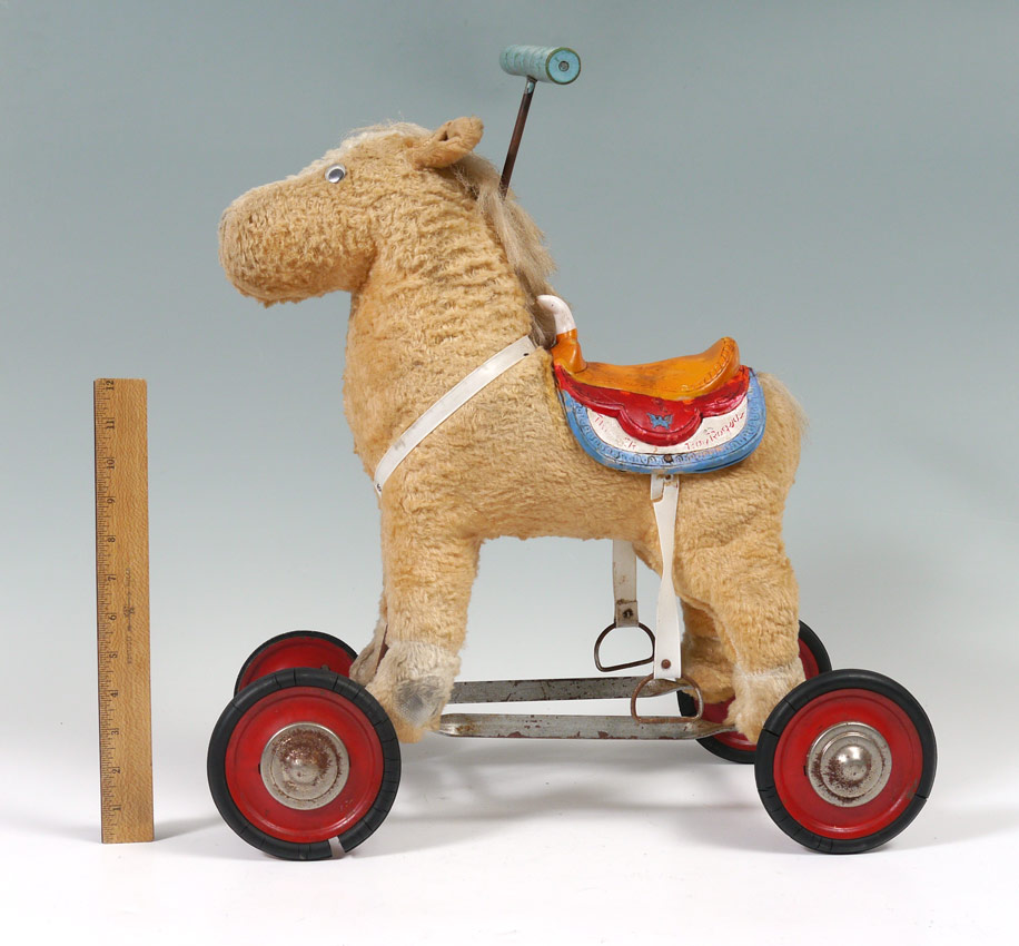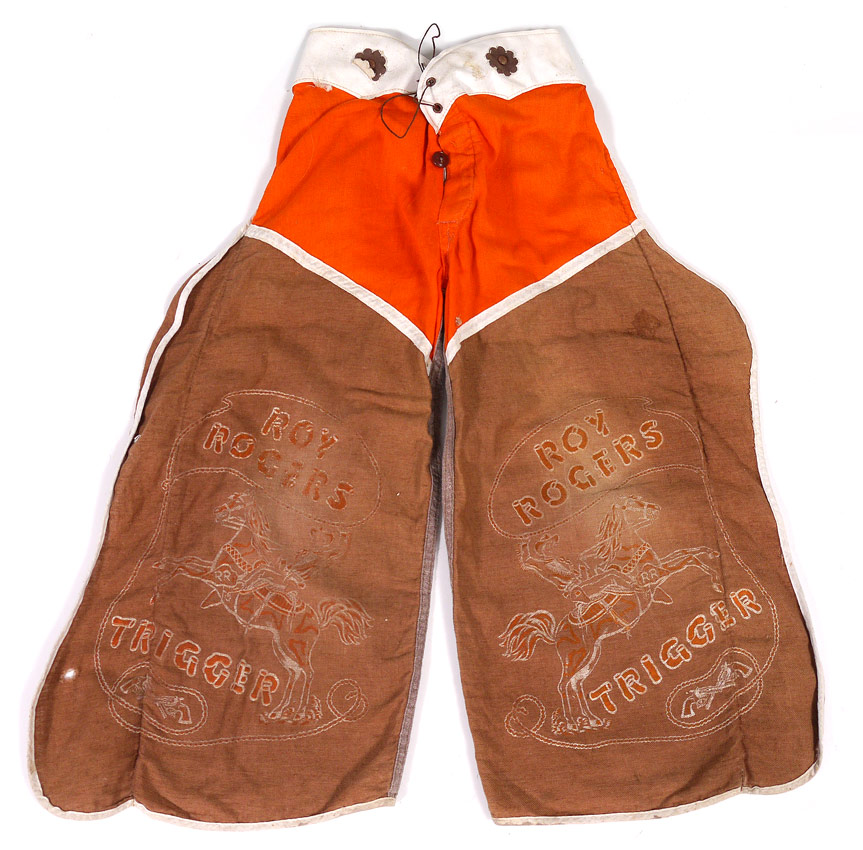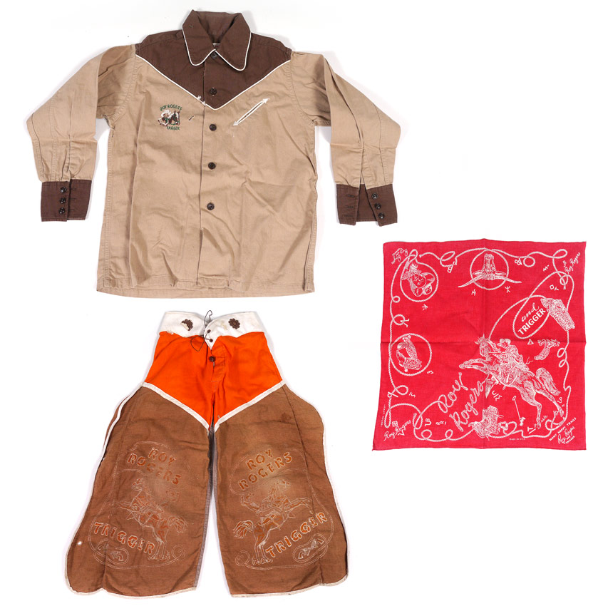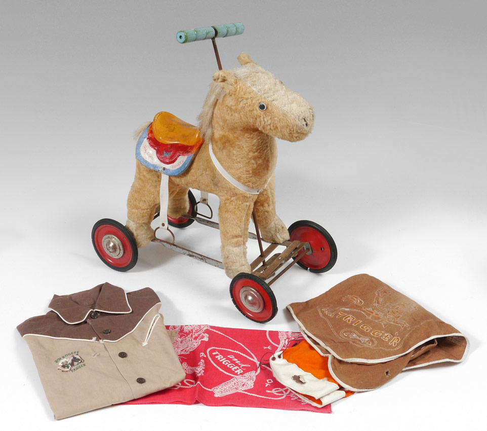 ROY ROGERS RIDE ON TRIGGER & CHILD'S OUTFIT: 4 pieces total to include 1) 4 wheeled child's ride on Trigger toy with vinyl saddle. Wood handle turns front wheels. Measures 21 1/2'' h. x 19'' x 10''. 2) Rob Roy ''Roy Rogers & Trigger'' child's Western style shirt, size 12. 3) Roy Rogers & Trigger cloth chaps. 4) Many Happy Trails bandana.