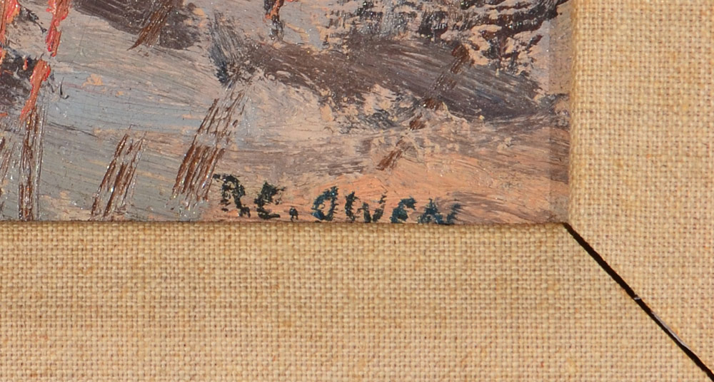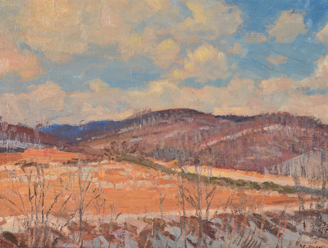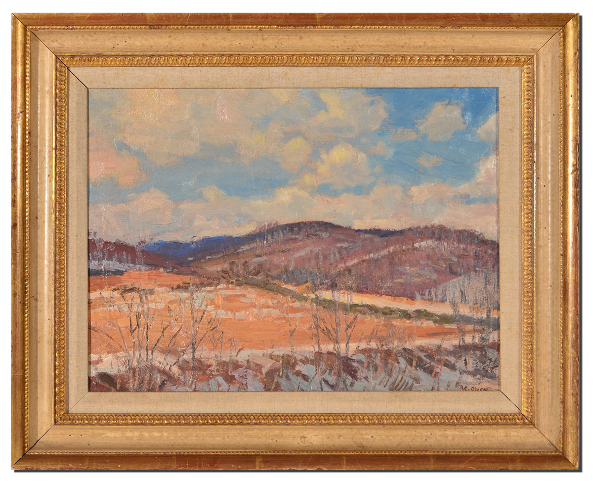 OWEN, Robert Emmett, (American, 1878-1957): New England Winter Valley Landscape, Oil/Canvasboard, 12'' x 16'', signed lower right, carved painted and gilded frame with wear 16 1/2'' x 20 1/2''.