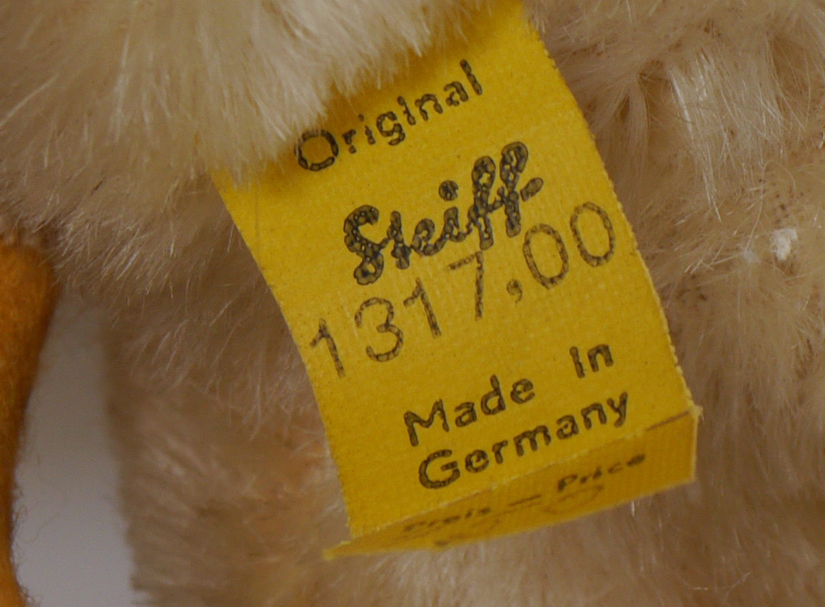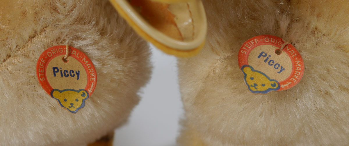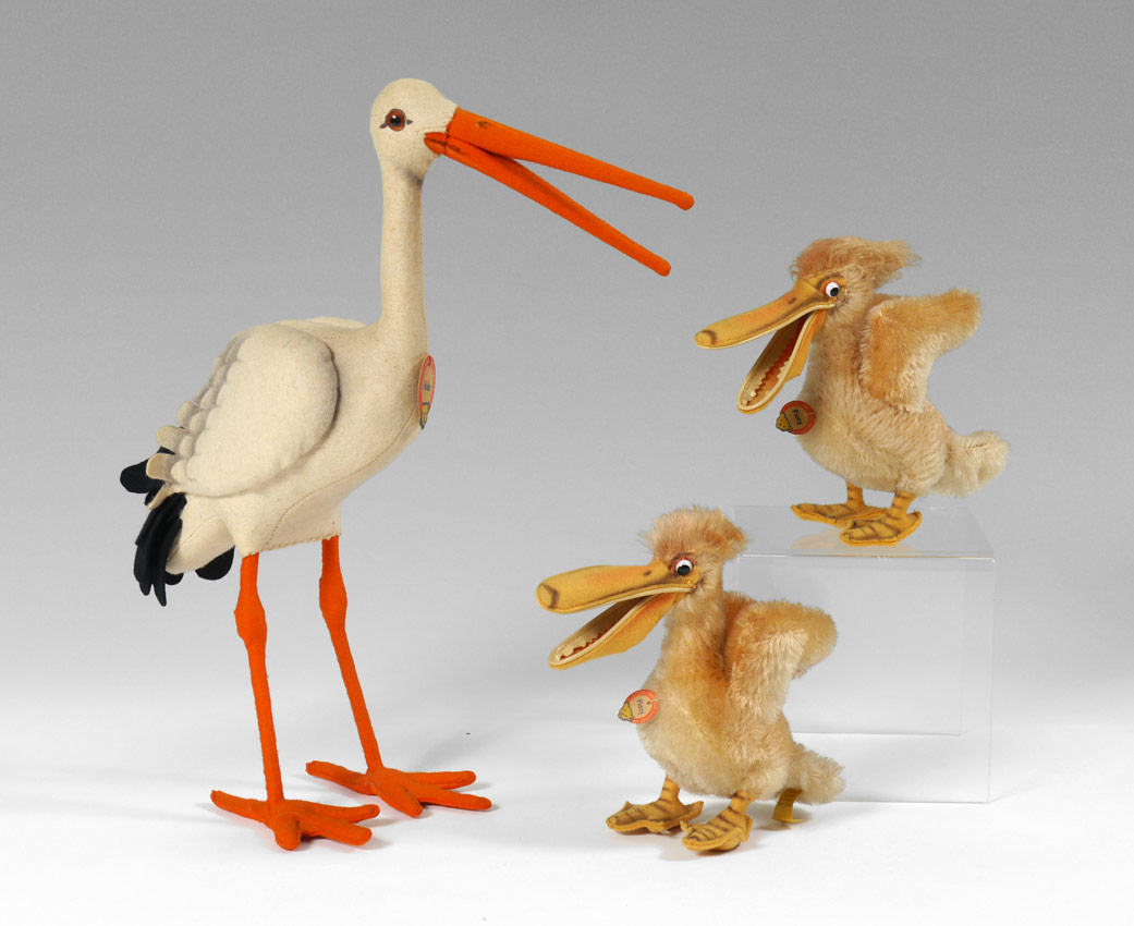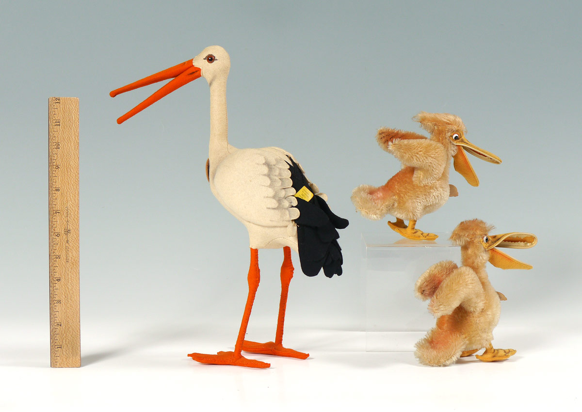 3 PIECE VINTAGE STEIFF PELICANS & STORK: 3 pieces total to include 1) Cloth ''Adebar'' stork, original button, tag number 1135, name tag, 14 1/4'' h. x 5 1/4'' x 11 3/4''. 2-3) Pair mohair ''Piccy'' pelicans, one with original button, tag number 1317,00, the other missing button and tag. Both with name tags, 6 1/4'' h. x 3'' x 6 1/4''.