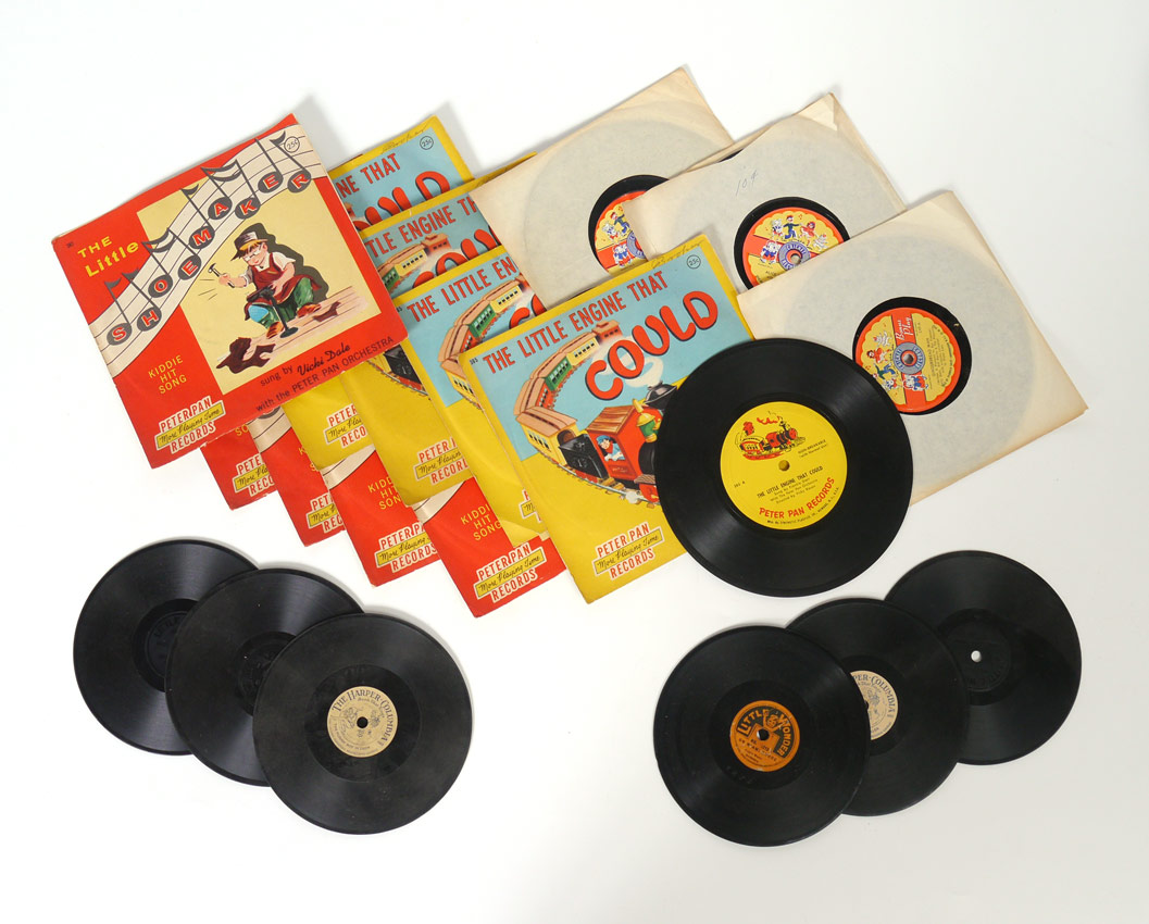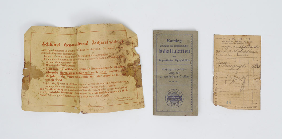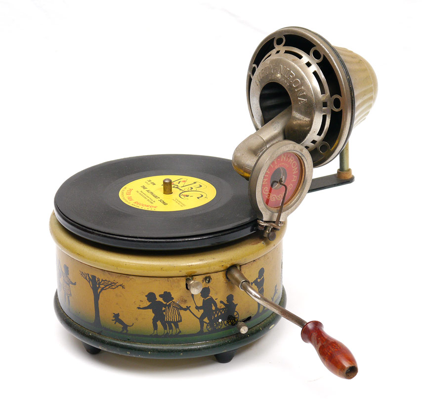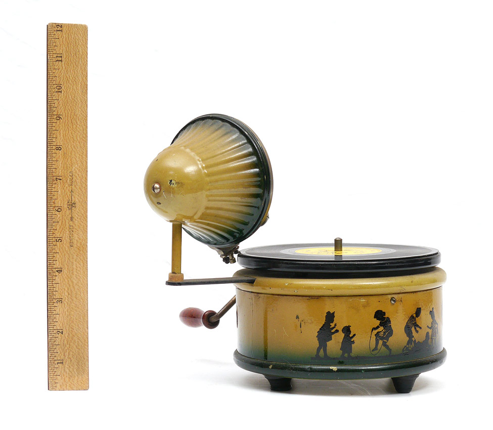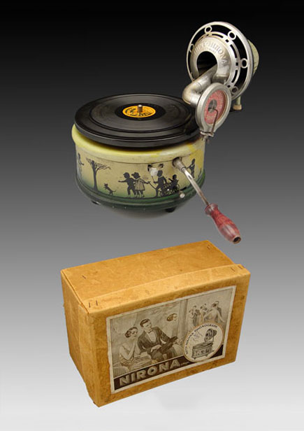 CHILD'S VINTAGE 1930'S NIFTY NIRONA PHONOGRAPH IN ORIGINAL BOX: Key crank working record player with black silhouette design. Made in Germany. Sold with collection of 20 child's records. Phonograph measures 9 1/4'' x 11 1/2''. Original box measures 5 3/4'' x 8 1/4'' x 12''.
