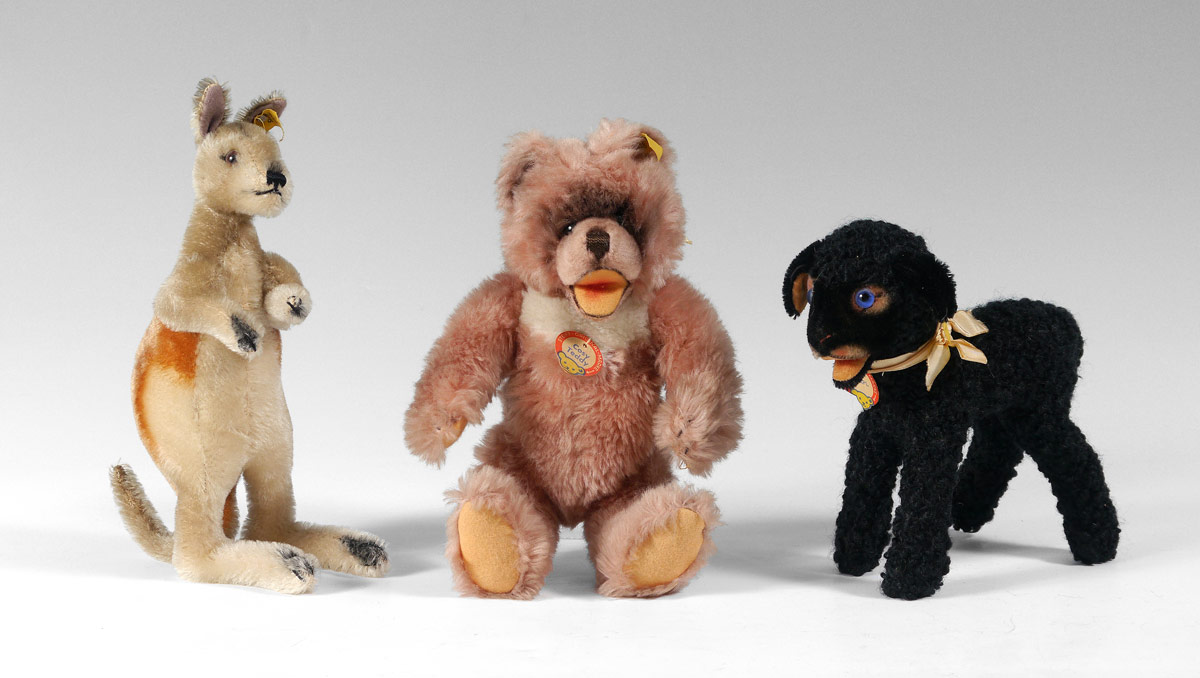 3 PIECE VINTAGE STEIFF KANGAROO, COZY TEDDY, LAMB: 3 pieces total to include 1) Mohair ''Linda'' kangaroo, original button, tag number 4328, missing name tag. 11 1/4'' h. x 3 1/2'' x 7 1/4''. 2) Plush ''Cozy Teddy'', original button, tag number 5630,00, name tag. 11 1/2'' h. 3) ''Swapl'' Persian lamb, original button, tag number 6322,06 name tag. 8'' h.
