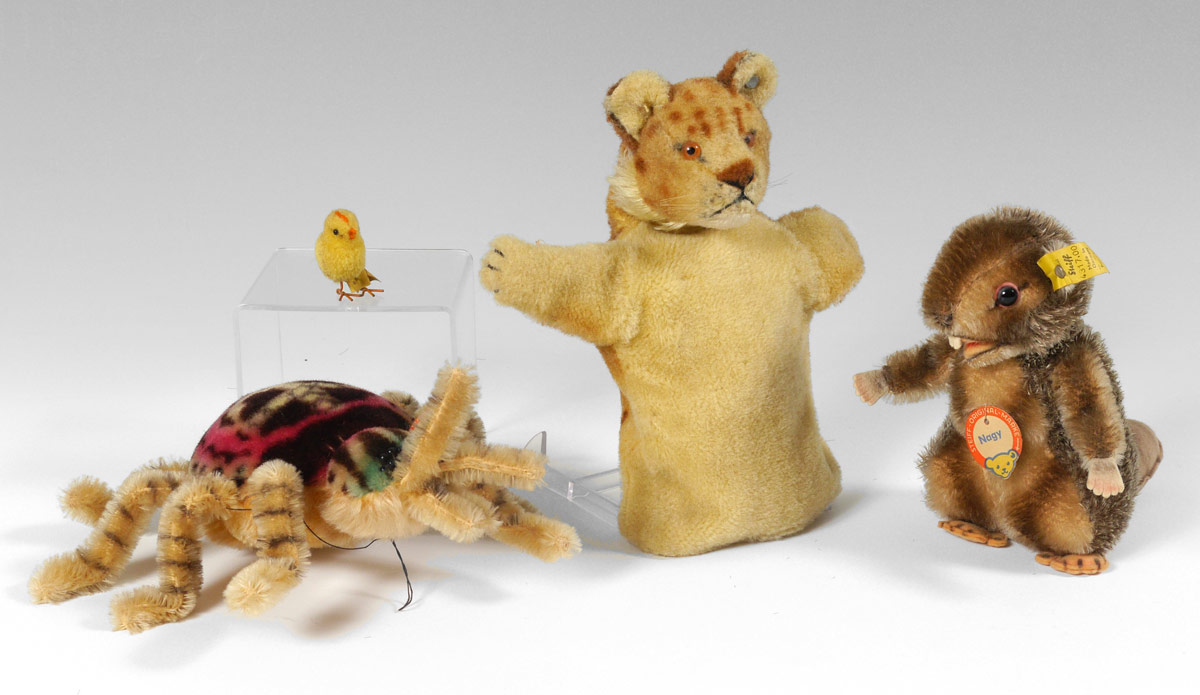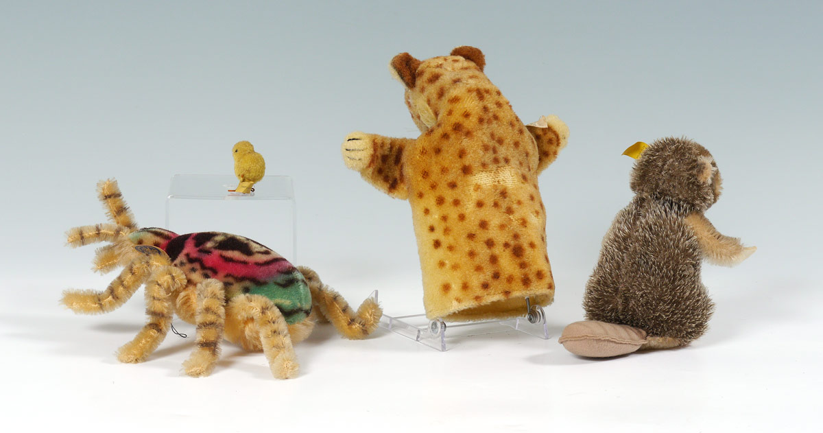 4 PIECE VINTAGE STEIFF BEAVER, SPIDY, LION HEAD PUPPET, CHICK: 4 pieces total to include 1) ''Nagy'' beaver, original button, tag number 4317,00, name tag. 6 1/4'' h. x 5'' x 7''. 2) ''Spidy'' spider, original button, missing tag, original name tag. 3) Lion hand puppet, original button, missing both tags, retains US- Zone Germany tag. 9 1/2''. 4) Chick, original button, tag number 1504, metal legs. 1 1/2'' h.