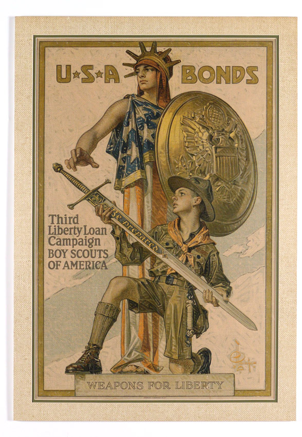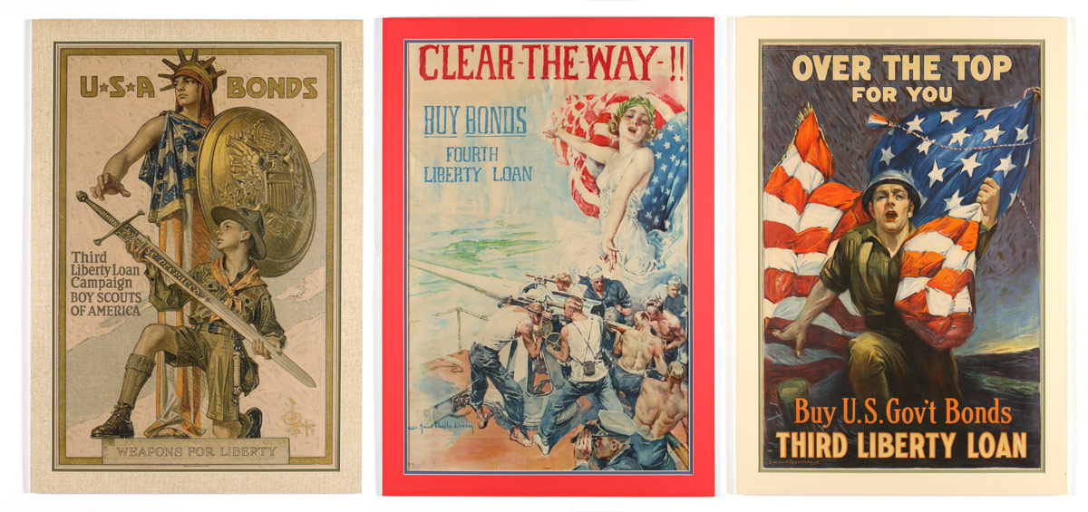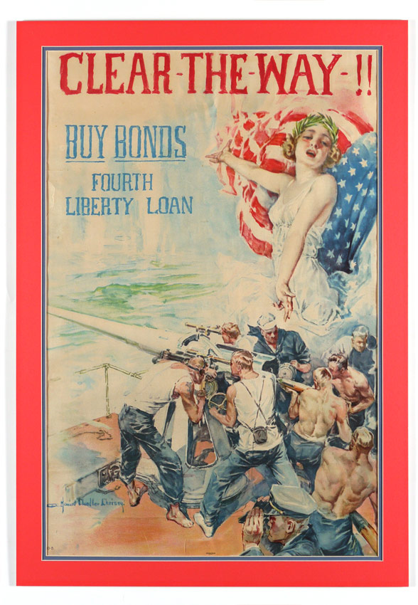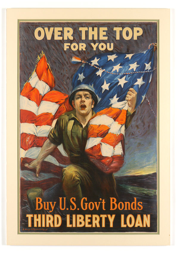 3 ORIGINAL WWI LIBERTY BOND WAR POSTERS: 3 posters total to include 1) Riesenberg, Sidney, ''Over The Top For You'', archival tape to mat, 30 '' x 20'', framed under glass 35 1/2'' x 25 1/2''. 2) Christy, Howard Chandler, ''Clear-The-Way'', Forbes Boston, archival tape to mat, 30'' x 20'', framed under glass 34 3/4'' x 24 1/2''. 3) Leyendecker, J. C., ''Weapons For Liberty'', Boys Scouts theme, laid down under mat, sight size 29 1/2'' h. x 19 1/2'', framed under glass, 34 3/4'' h. x 25 1/2''.