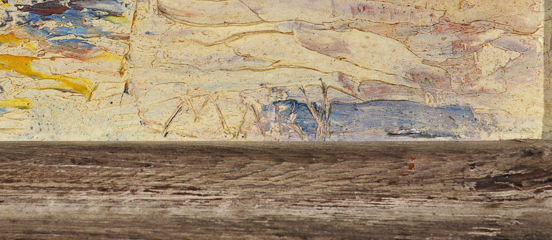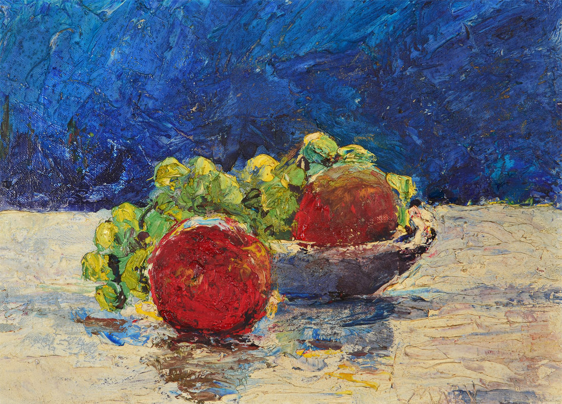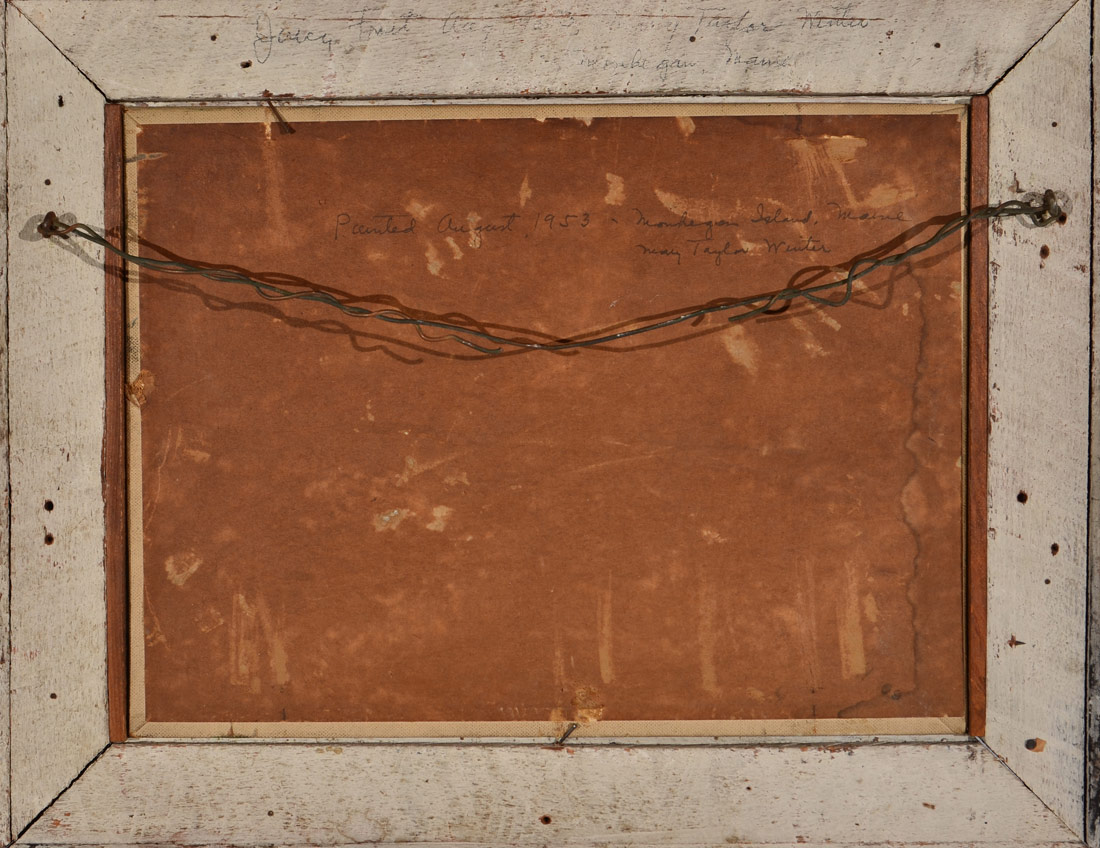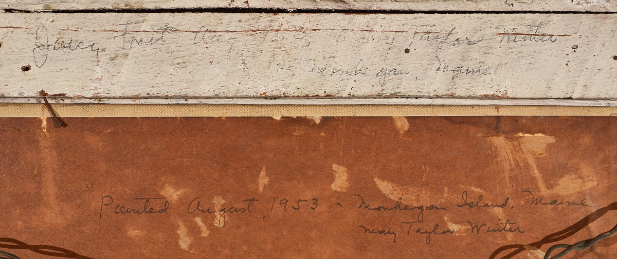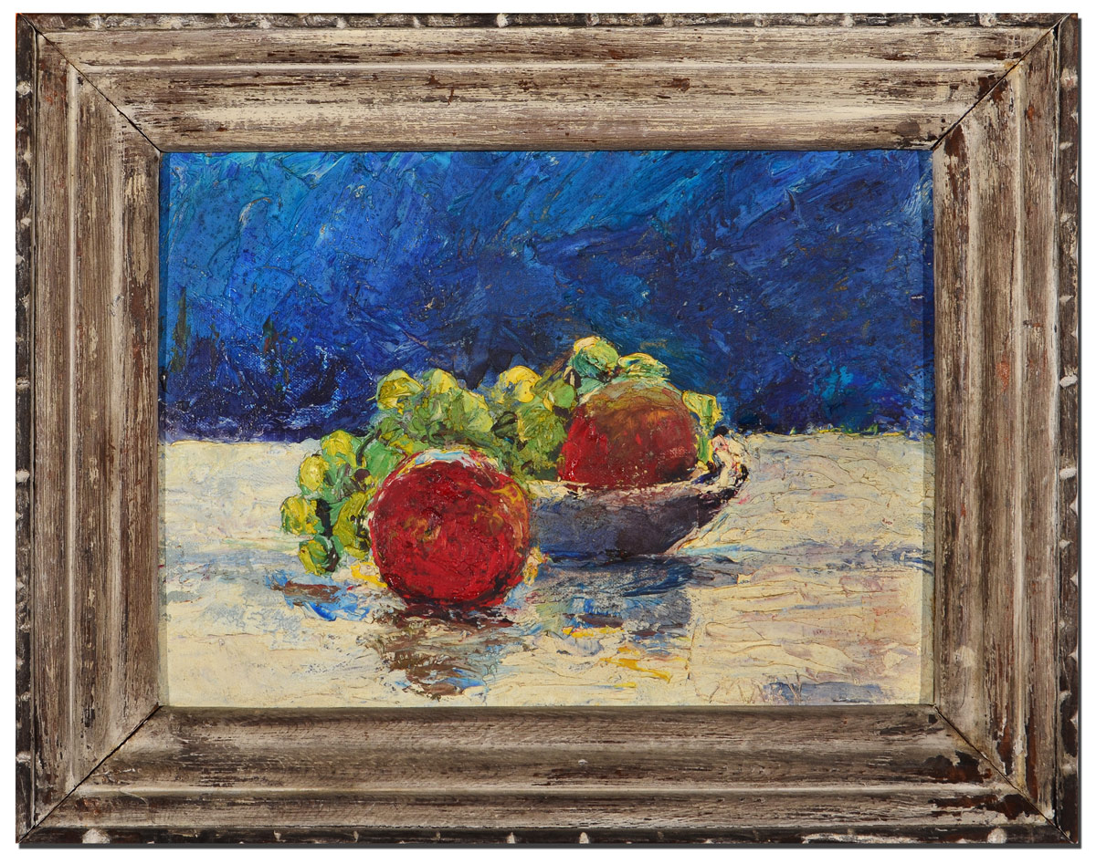 WINTER, May Taylor, (American, 1895-1970): Still Life of Fruit, Oil/Canvasboard, 9'' x 12'', monogrammed lower right, inscribed verso, painted August 1953, Monhegan, Maine, signed May Taylor Winter, carved and painted frame 12 1/2'' x 16''.