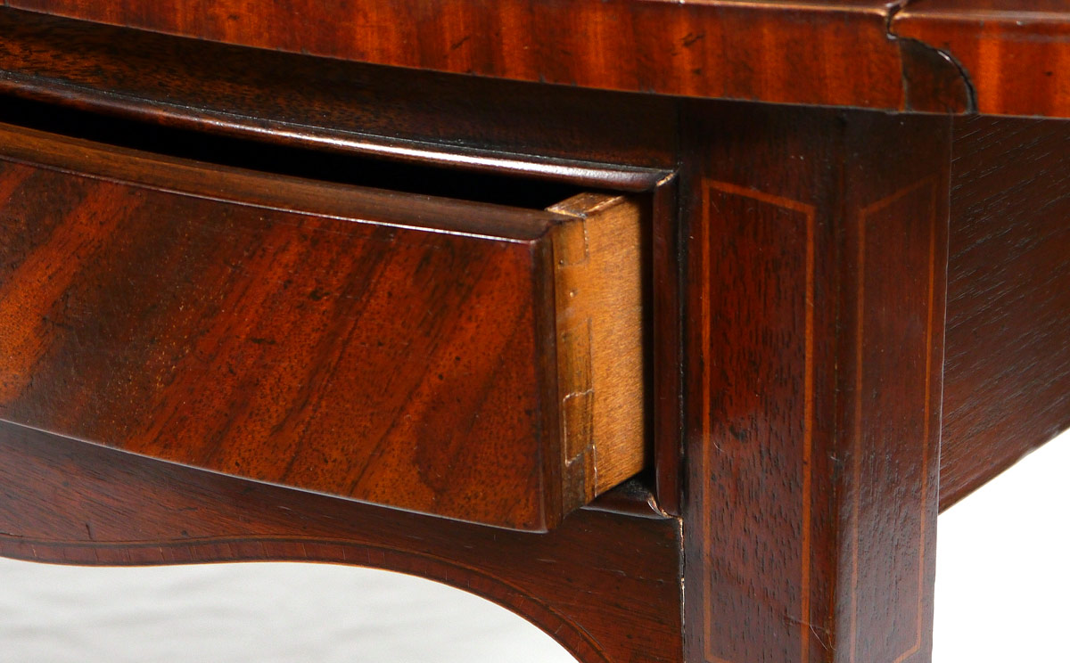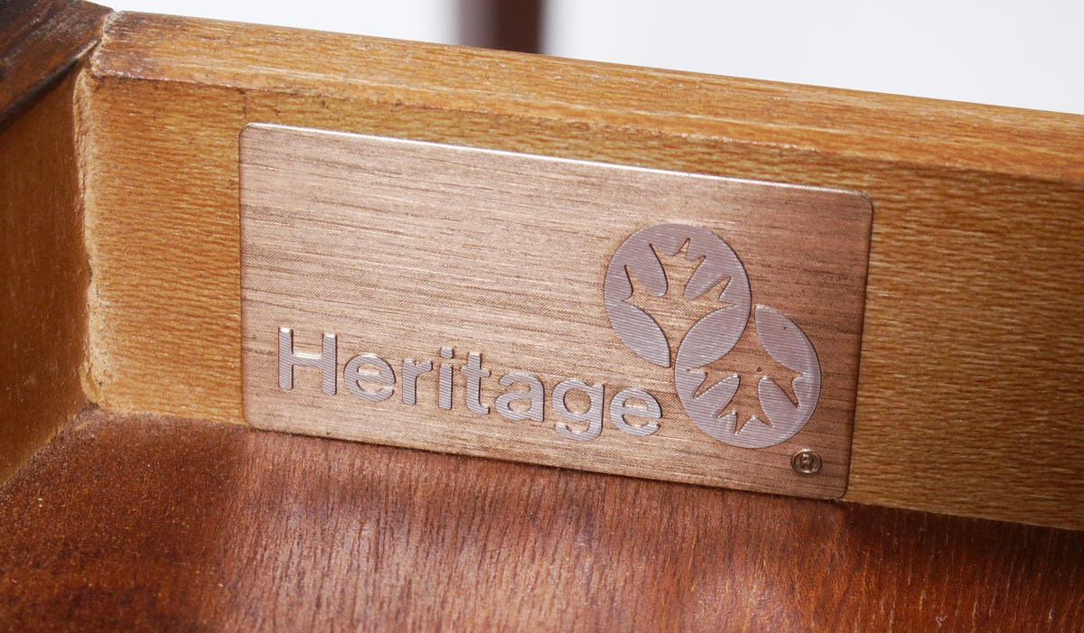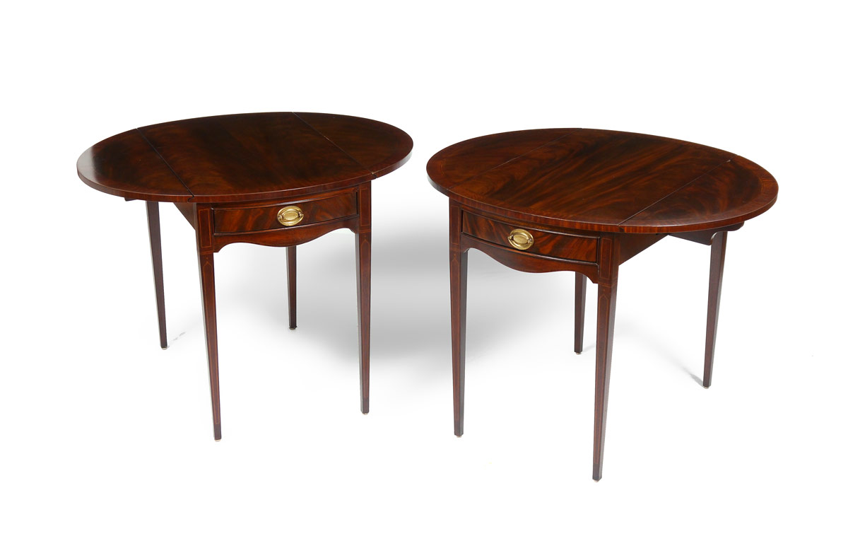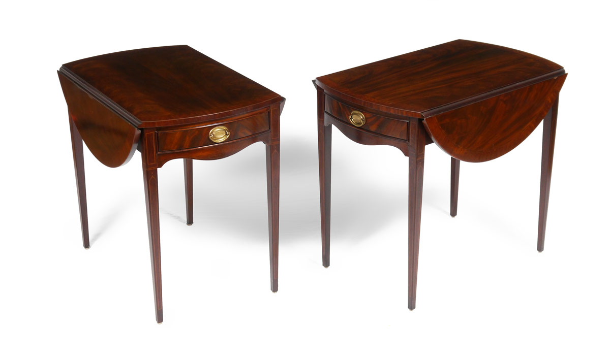 PAIR DREXEL HERITAGE MAHOGANY PEMBROKE SIDE TABLES: Each banded mahogany with drop leaves, single drawer, shaped skirt, tapered legs. Heritage tag inside drawer. 27 1/4'' h. x 30 3/4'' x 20 1/4''.