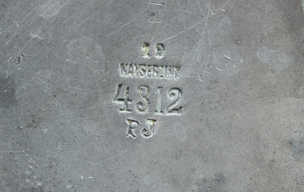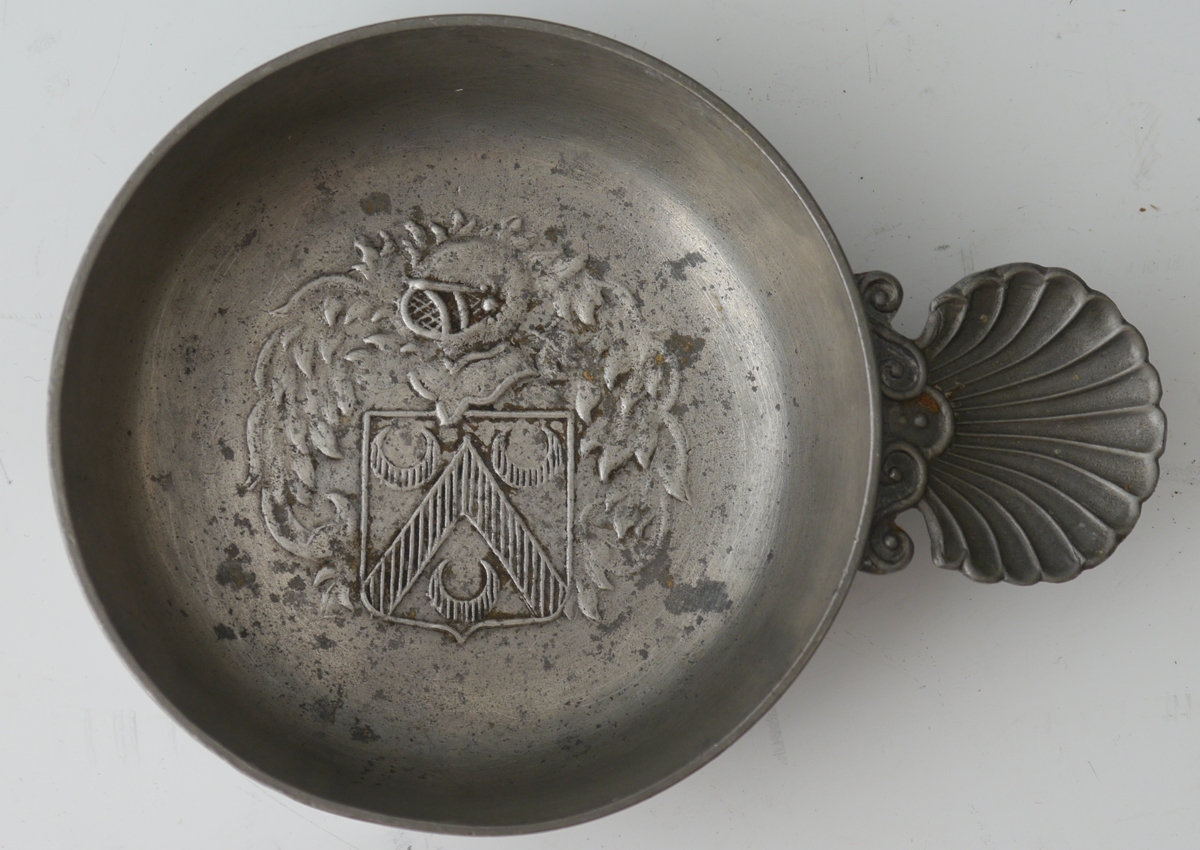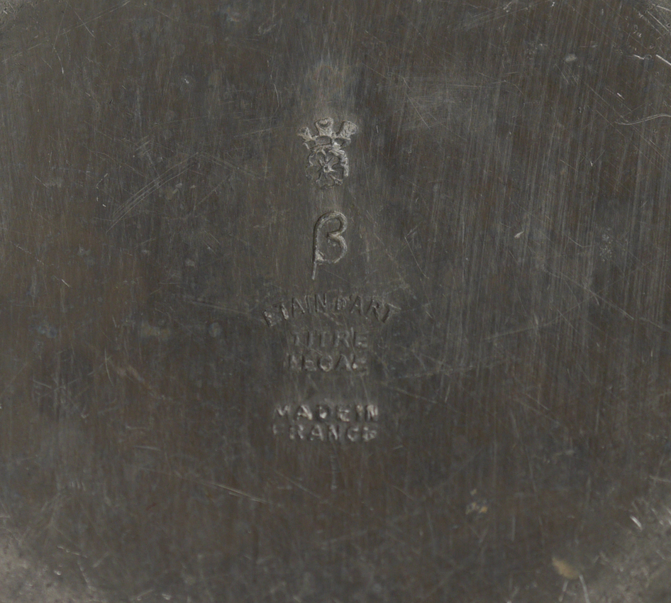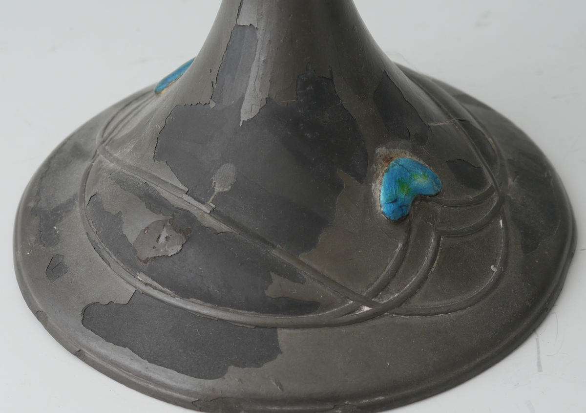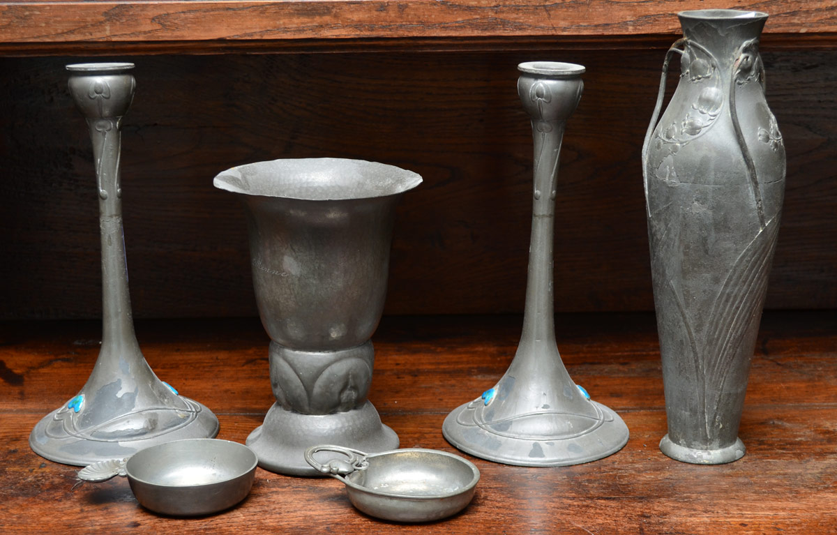 6 PIECE ART NOUVEAU ERA PEWTER: 6 pieces total to include 1) Jin vase, inscribed Minne, 8'' h. x 6''. 2) Kayserzinn vase, #4312, 12 1/2'' h. x 3 3/4''. 3-4) Pair Tudric candlesticks with enamel decoration, #0333, 11'' h. x 5 5/8''. 5) Nekrassoff porringer, 5''. 6) Etain D' Art French porringer, 4 3/4''.