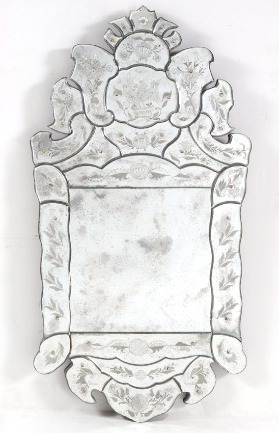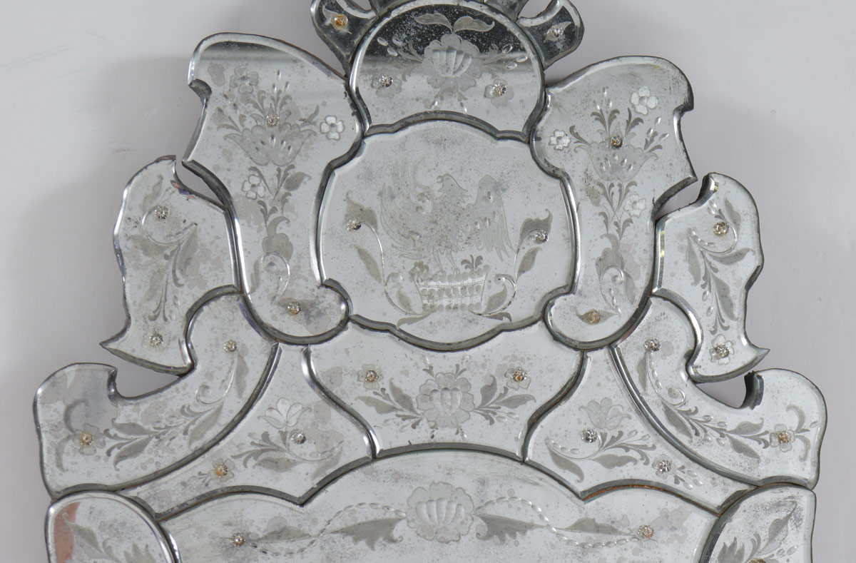 VENETIAN GLASS WALL MIRROR: 20th century, etched and applied glass with florets. Overall measures 42'' x 21 3/4'' x 1''