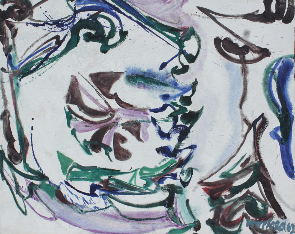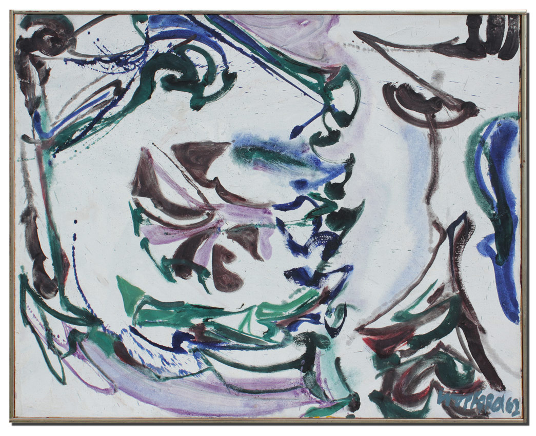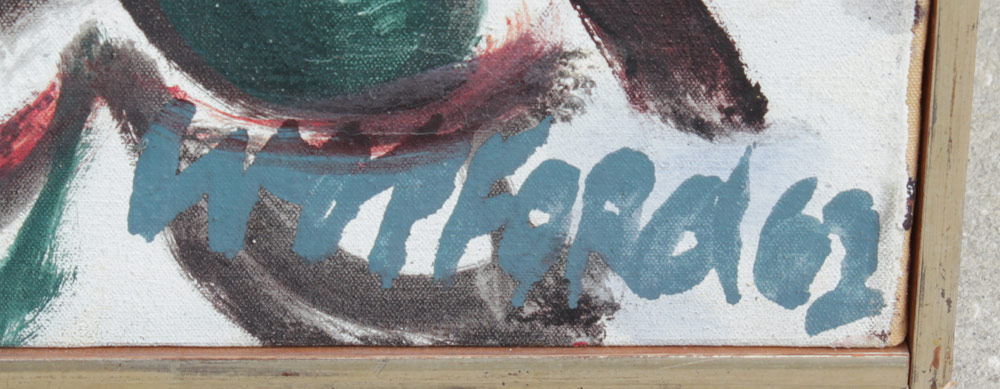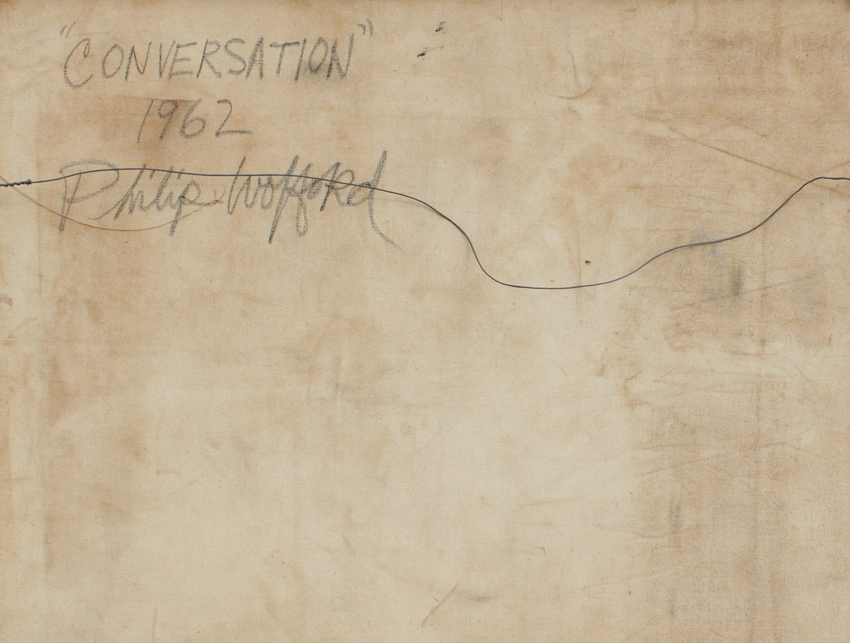 WOFFORD, Philip, (American, 1935- ): ''Conversation'', Abstract Composition, Oil/Canvas, 30'' x 38'', signed lower right, dated ' 62, signed titled and dated verso, thin edge wood frame with metal application 31'' x 39''.