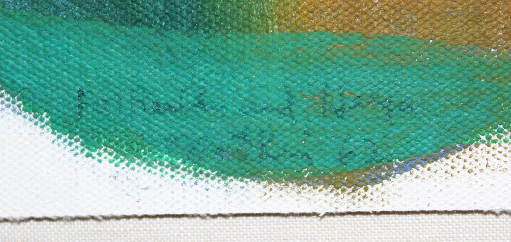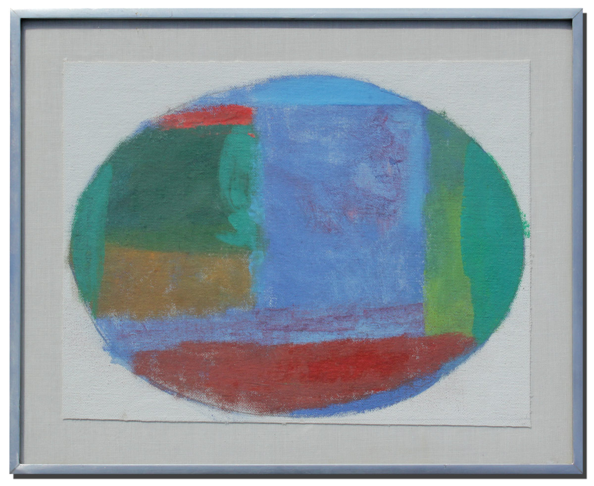 NATKIN, Robert, (American, 1930-2010): Colorful Abstract arrangement of Ethereal Geometric Color Masses with an Oval, Oil/Canvas/mounted to board, unsigned, framed in a metal strip molding 9'' x 12'', signed and dedicated in left margin, custom metal frame 11 3/4'' x 14 5/8''.