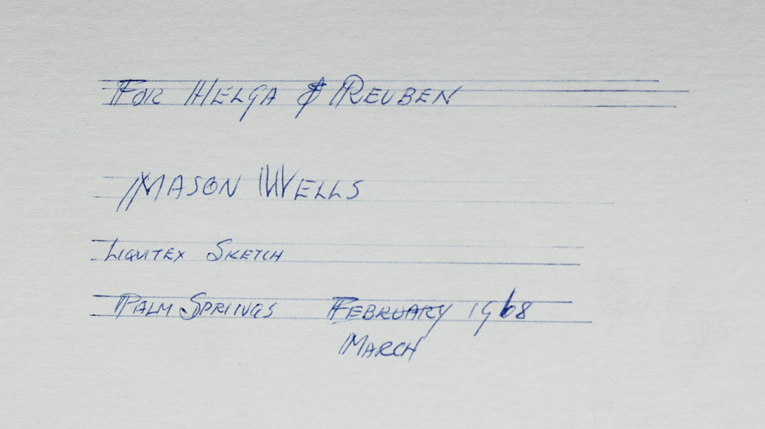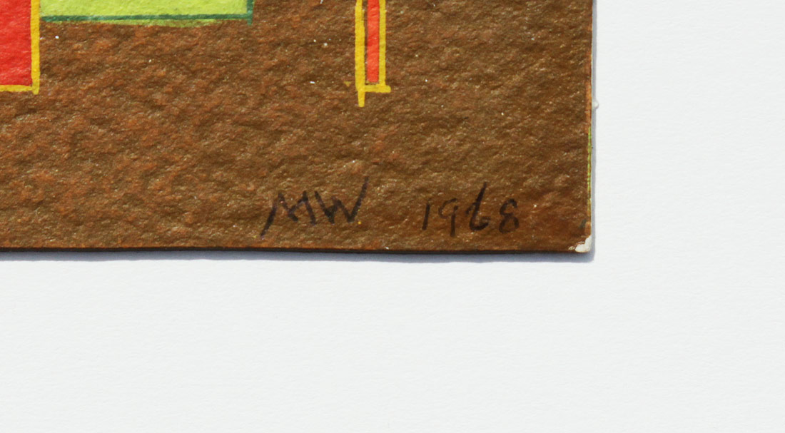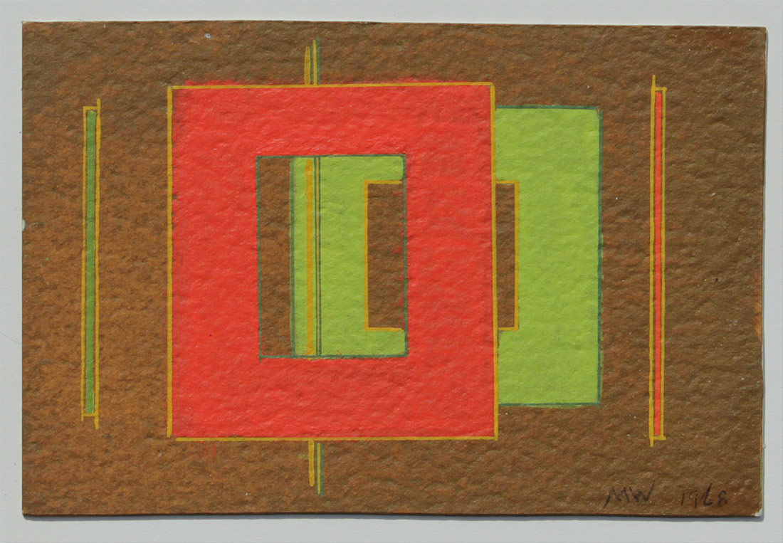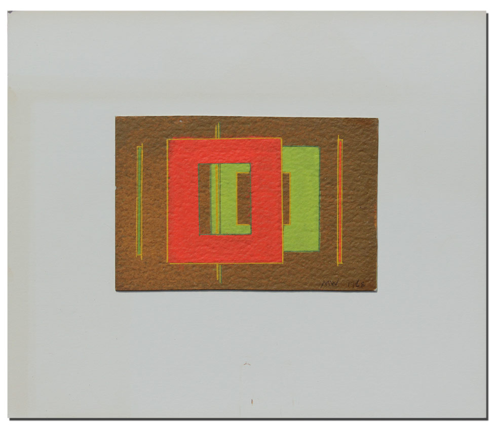 WELLS, Mason Bacheller,(American, 1906-1984): Liquitex Sketch of Geometric Forms & Lines, 4'' x 6'', initialed M.W. lower right, dated 1968, dedicated verso for Helga & Ruben, signed Mason Wells, Palm Springs, February 1968, affixed to white card backing, overall measurements 9 1/2'' x 11''.