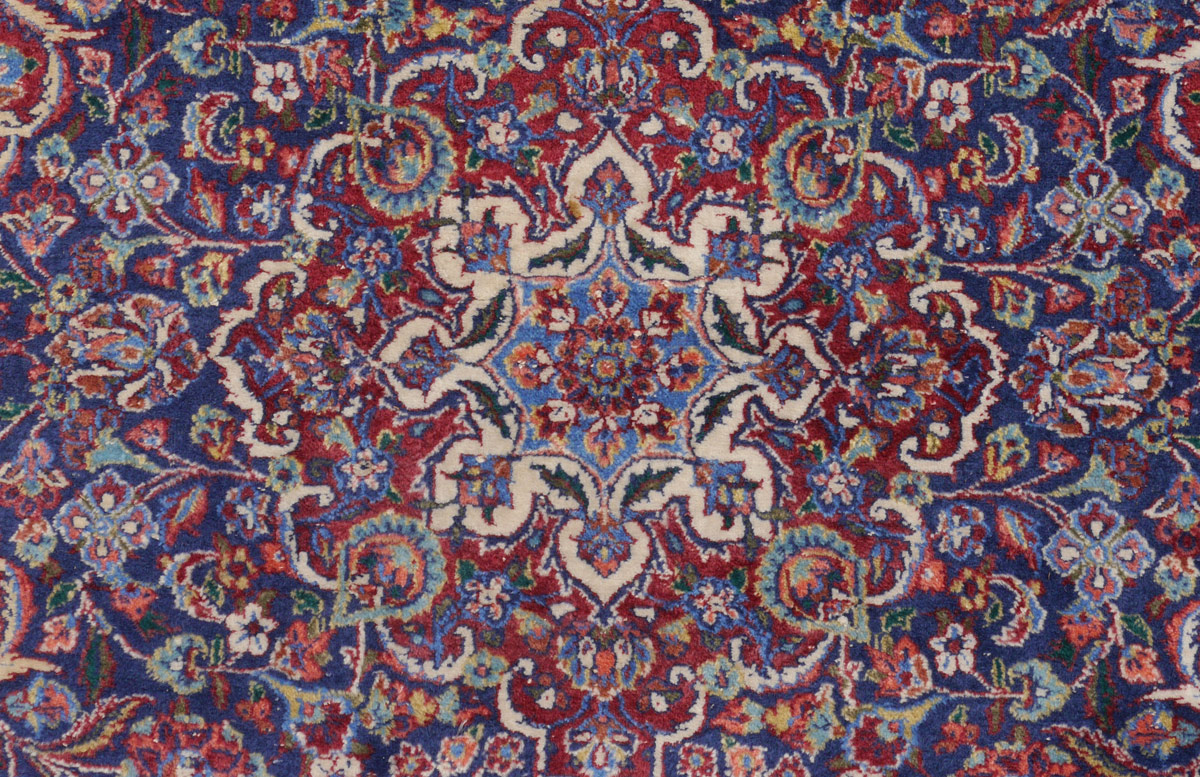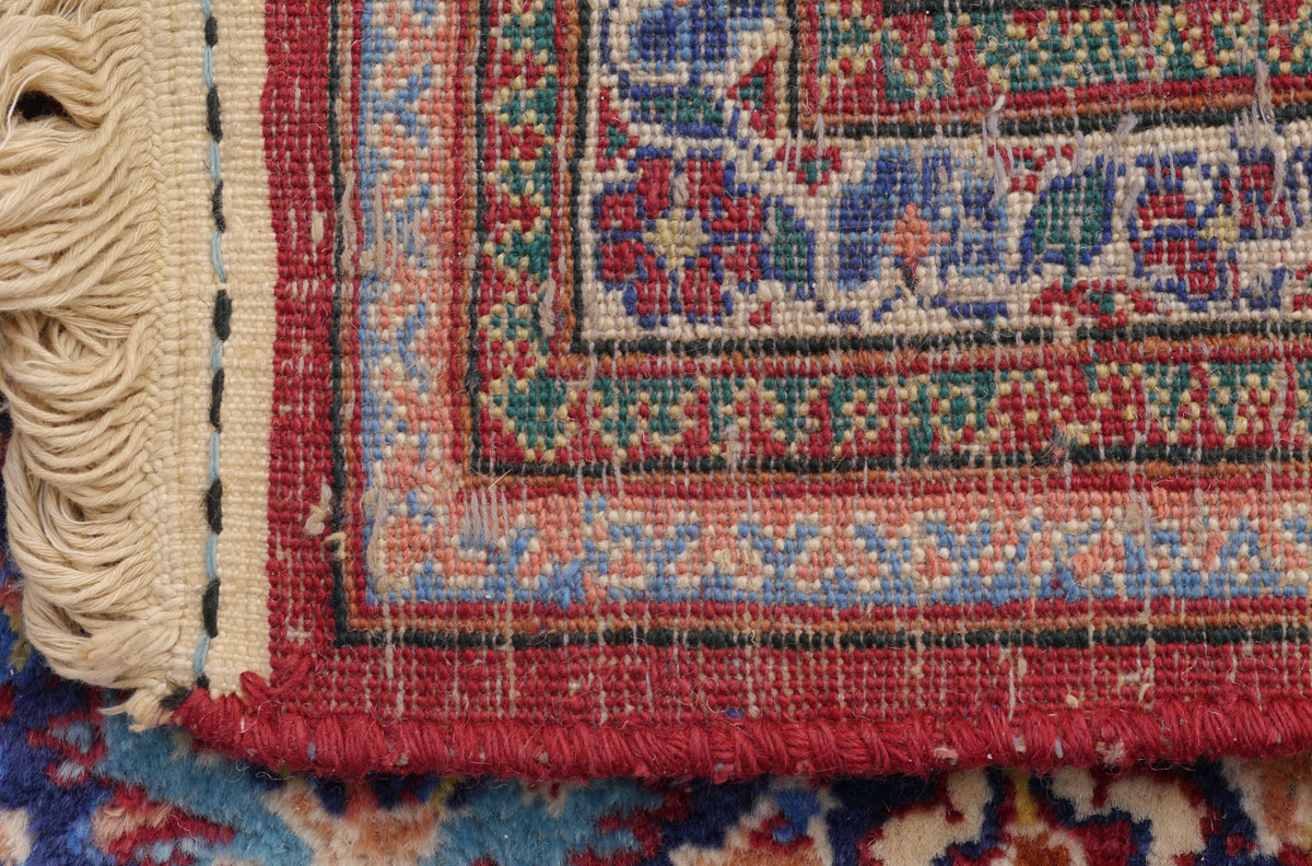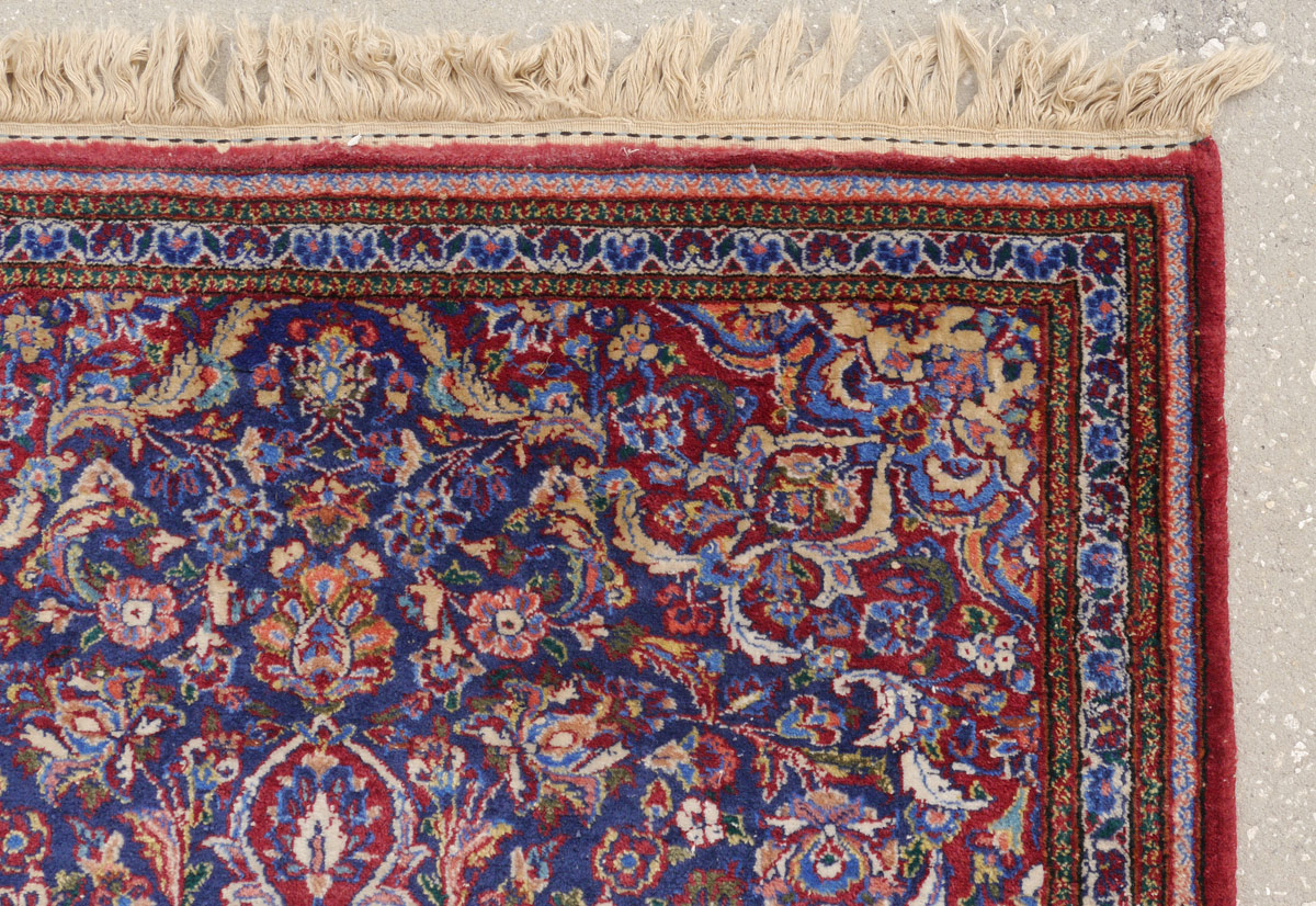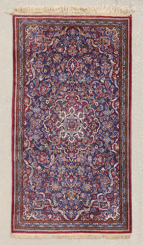 APPROX 20-40 YR OLD ORIENTAL HAND KNOTTED WOOL RUG, 3'6'' X 5'10'': This finely knotted rug 's origin is not clear to me, but its quality is. The rug has a traditional curvilinear medallion design found on many Persian city rugs, but the blending of colors and the finishes are a little different. Nevertheless the rug is well made with its white on red on blue field medallion to its crisp small borders. Condition is good.