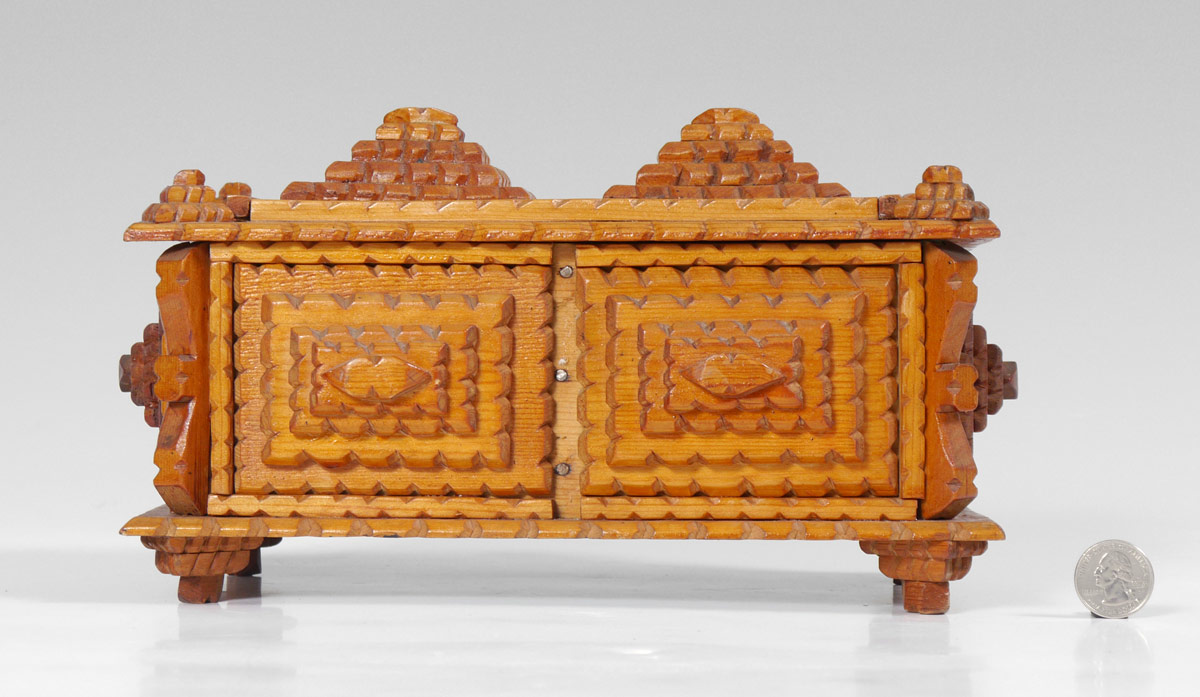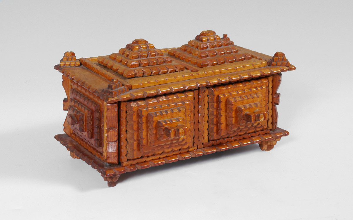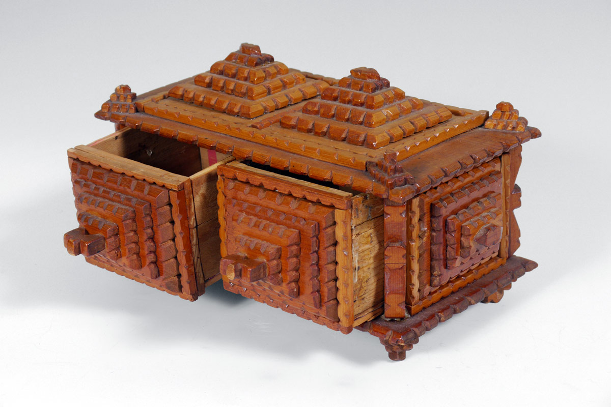 TRAMP ART DIMPLED 2 DRAWER BOX: Double 6 pyramid top, 6 pyramid drawers, 5 pyramid sides and double back. 6 1/4'' h. x 10 3/4'' x 8''