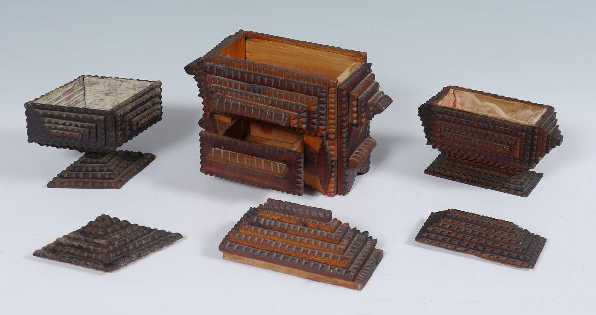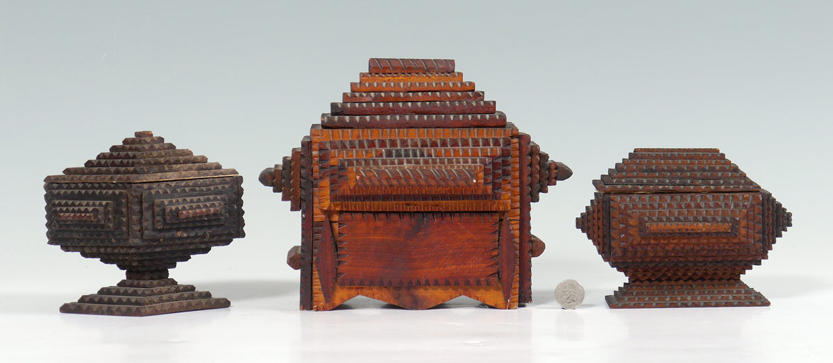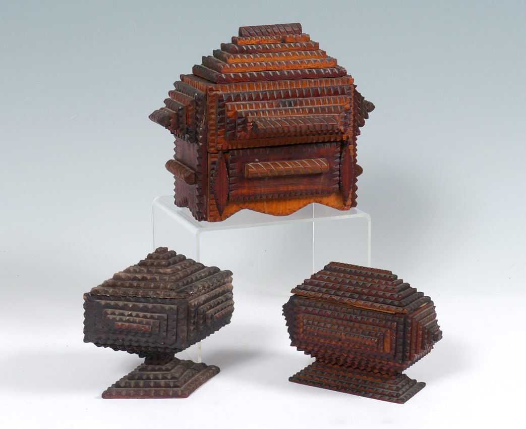 3 TRAMP ART BOXES: 3 pieces total to include 1) Box with slide lid over single drawer, 5 level pyramids top and sides, applied handles. 8 1/4'' h. x 10'' x 7 1/2''. 2) 7 pyramid top with 5 and 6 pyramid sides, 10 level base. Upholstered interior in need of repair, 5'' h. x 7'' x 4 1/4''. 3) Diamond shape with 7 pyramid top, 5 pyramid sides, 9 level base.