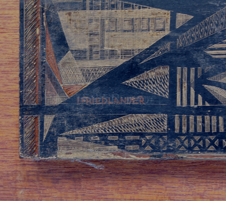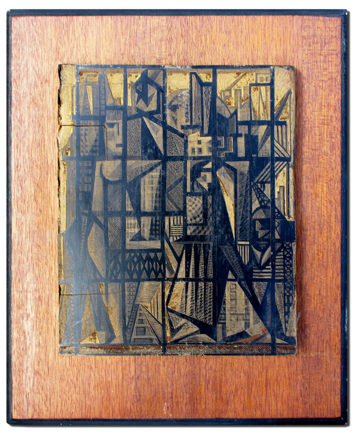 FRIEDLANDER, Issac, (American, 1890-1968): Cubist Urban Scene with Figures, Woodblock Original Plate (this is the actual wood that was used to create the prints), 12'' x 10 1/8'' x 1'', affixed to a wood backboard 18'' x 15'', signed in the plate lower right.