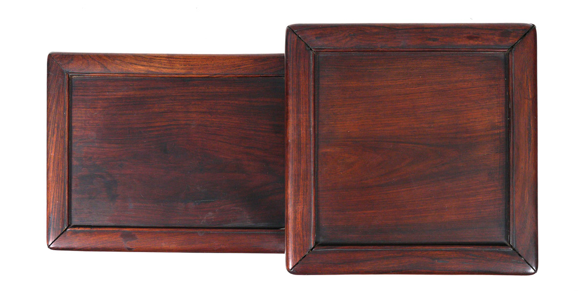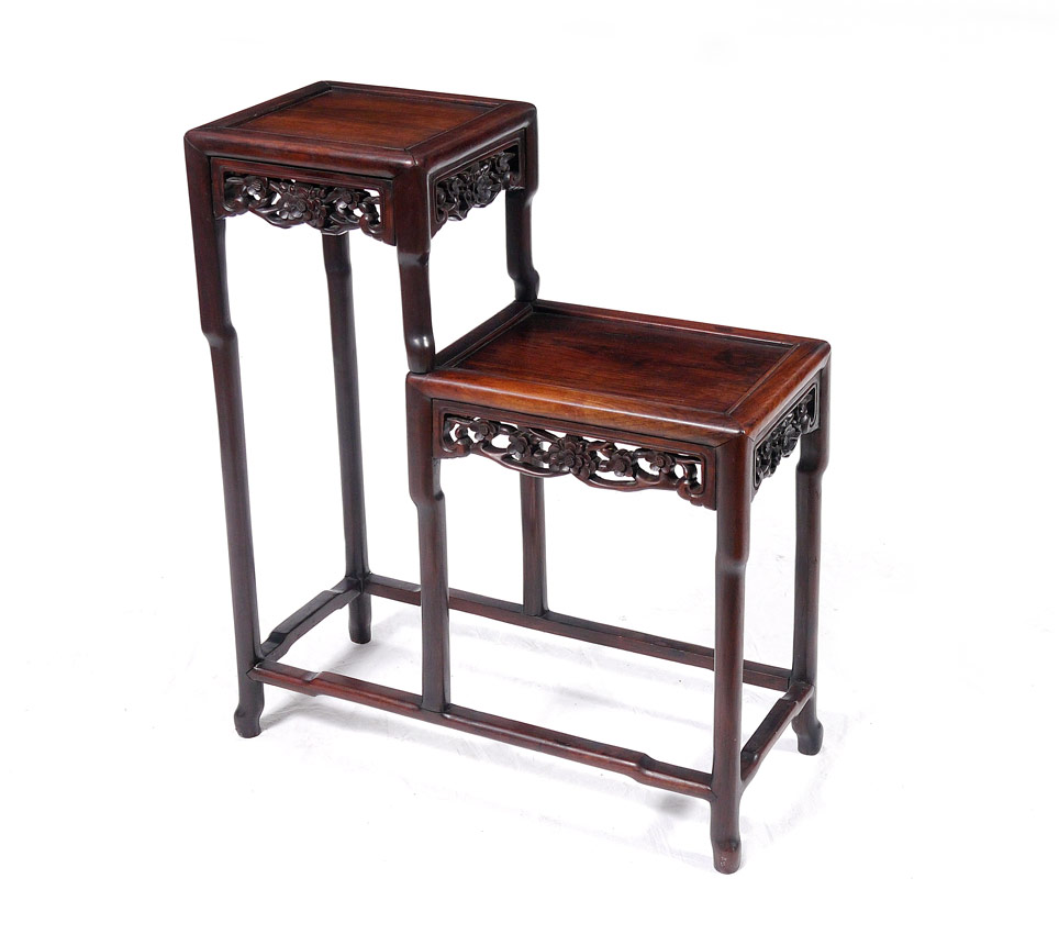 CHINESE ROSEWOOD TIERED TABLE: 2 tiers with each tier haveing carved and openwork floral motif skirts. Shaped supports. Measures 31 1/2'' h. x 26 3/4'' x 12 1/4''.
