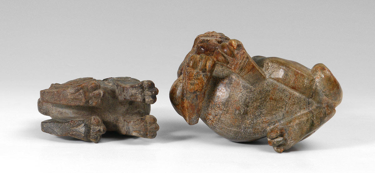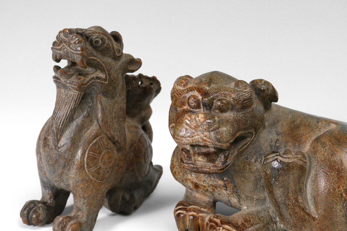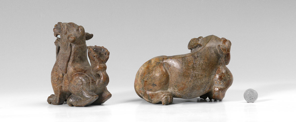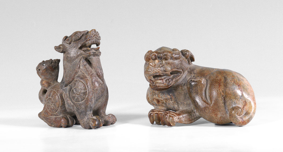 2 CHINESE CARVED STONE FOO DOGS: Nicely detailed figures. One measures 5 3/4'' h. x 4 3/4'' x 2 3/4'', the other 4 1/2'' h. x 7'' x 4 1/4''.