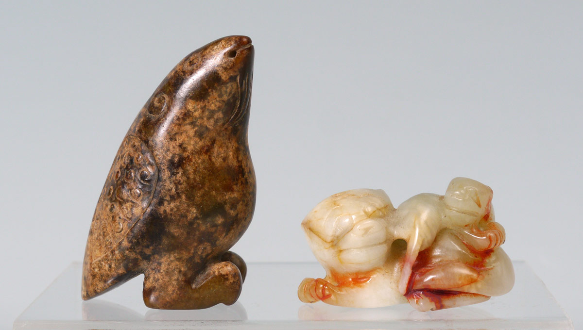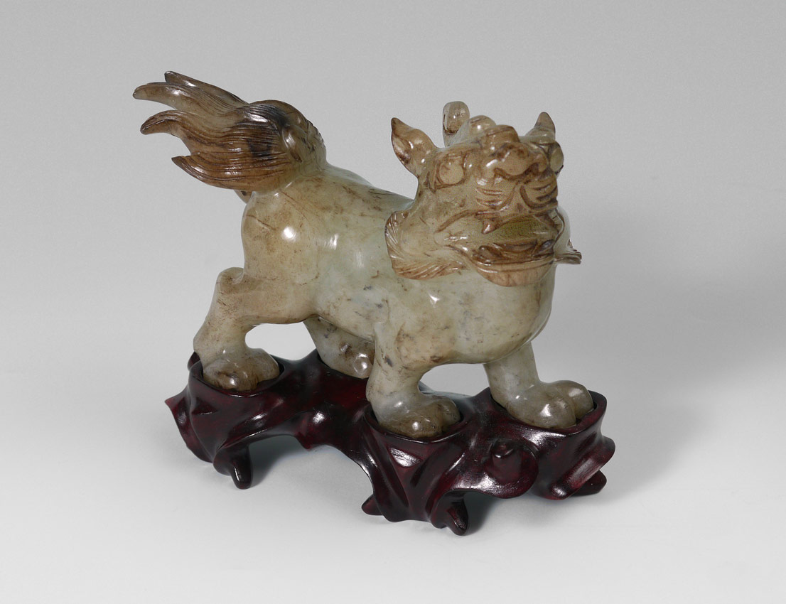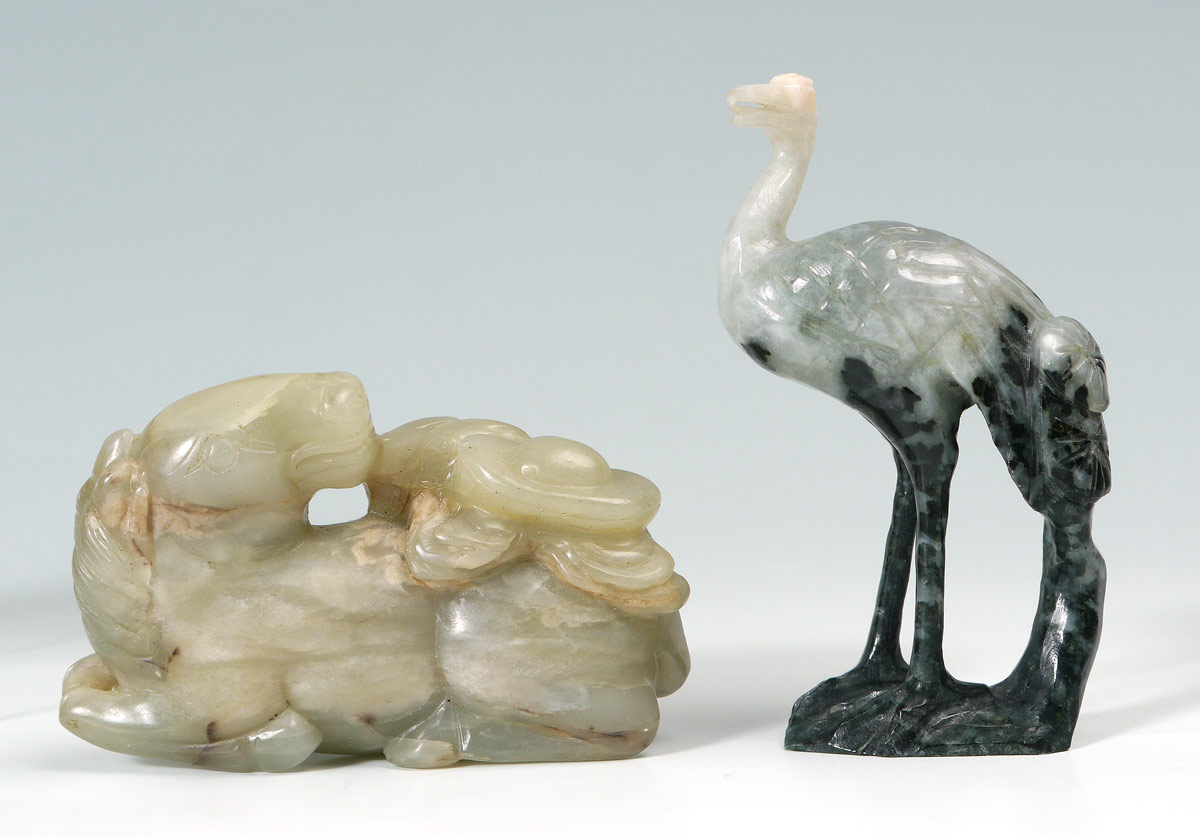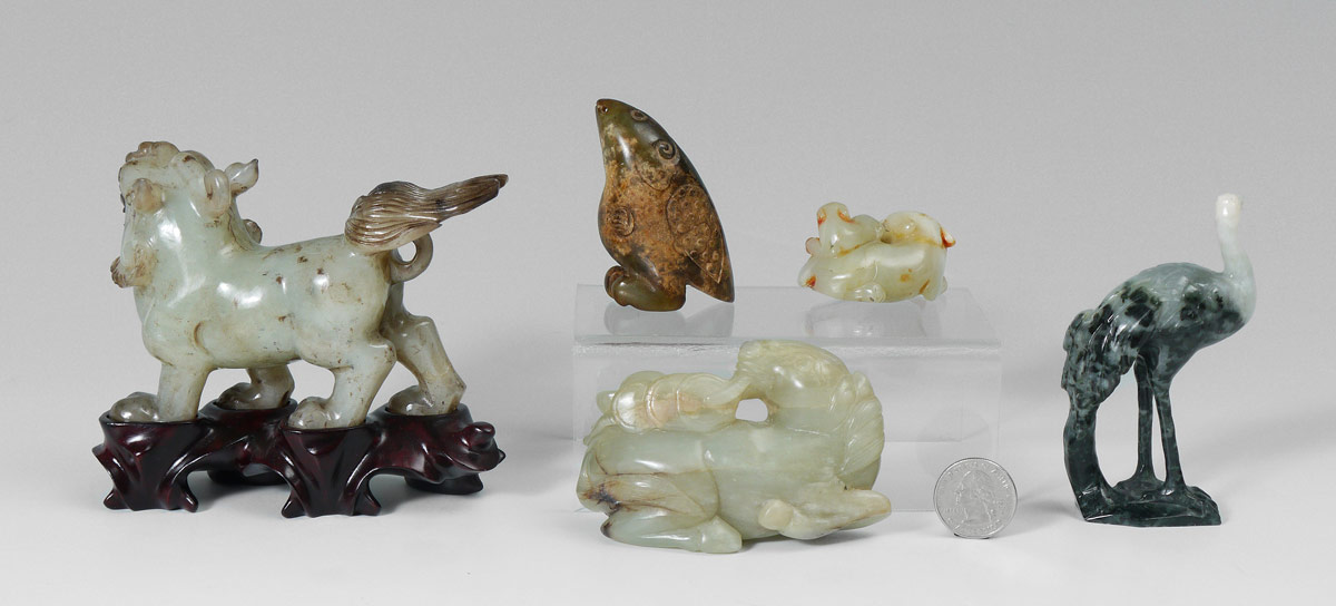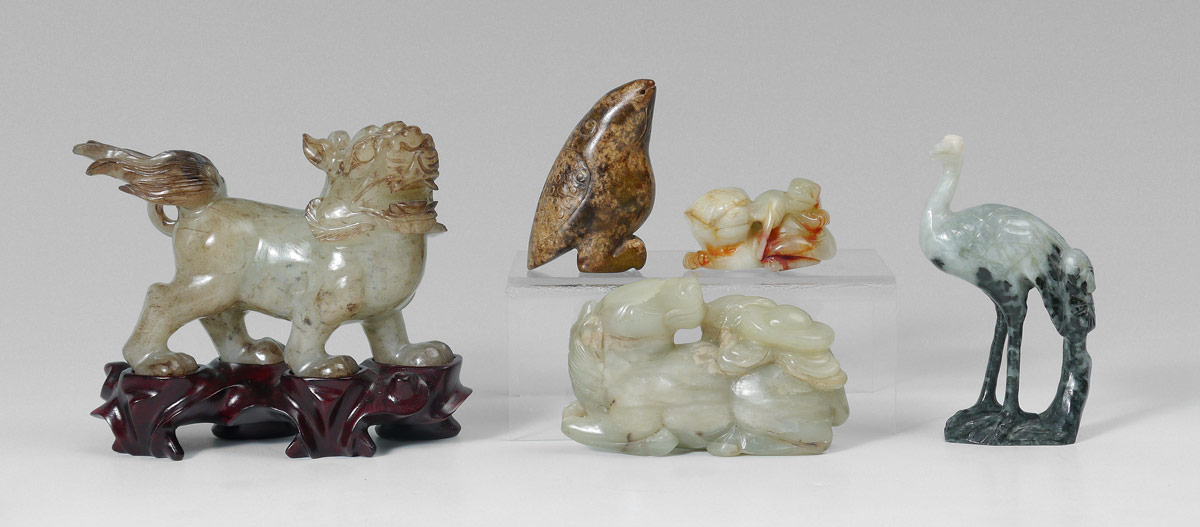 5 PIECE CHINESE CARVED STONE FIGURES: 5 pieces total of assorted carved hard stone to include 1) Standing crane, 4'' h. 2) 2 dogs lying down, one on the back of another, 2'' long. 3) Horse in repose, 2 1/4'' x 3 1/2''. 4) Figural bird, 2 5/8'' h. 5) Foo lion 3 1/4'' h. x 4 3/4'' with carved wood stand, 4 3/4'' long.