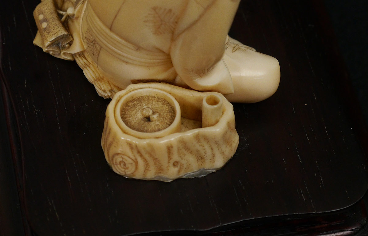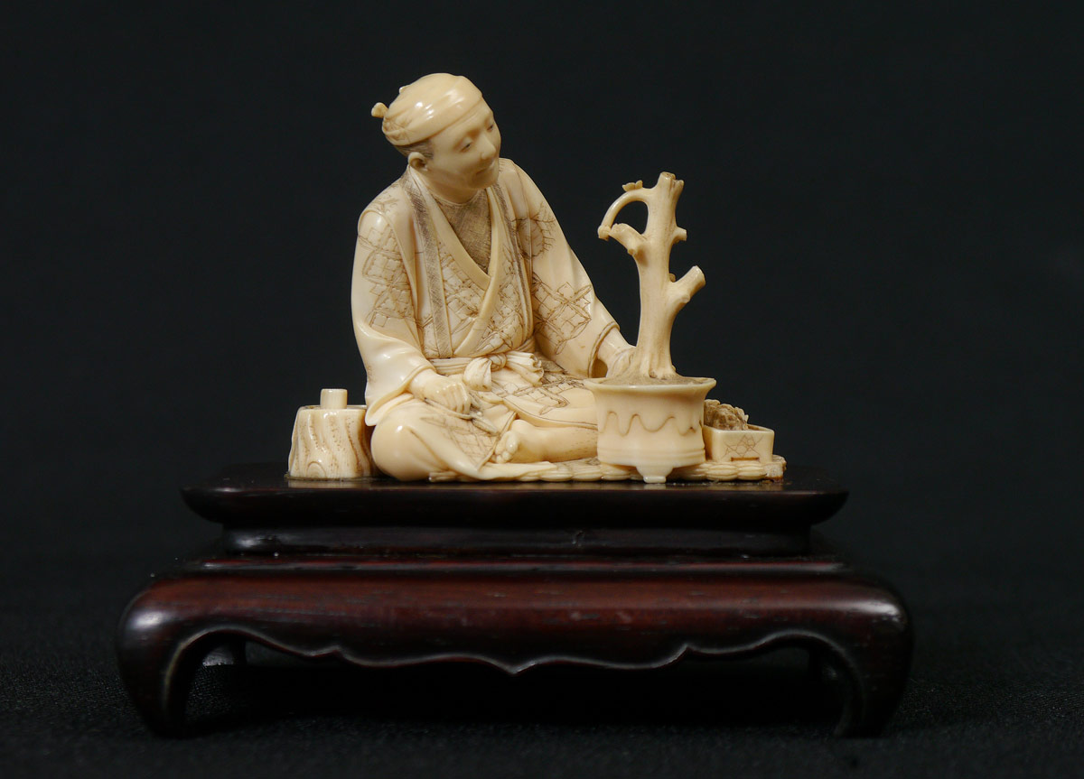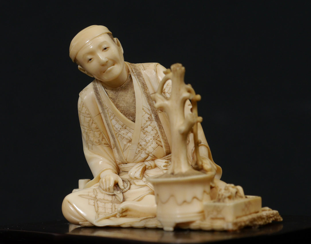 MAN TENDING BONSAI IVORY GROUPING: Figure of a seated man tending to bonsai tree with pruning instruments. Affixed to wood base, overall 2 1/2'' h. x 3 1/4'' x 2 1/4''.