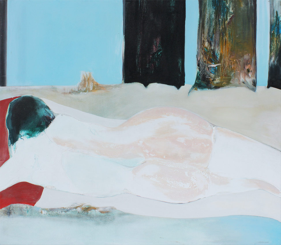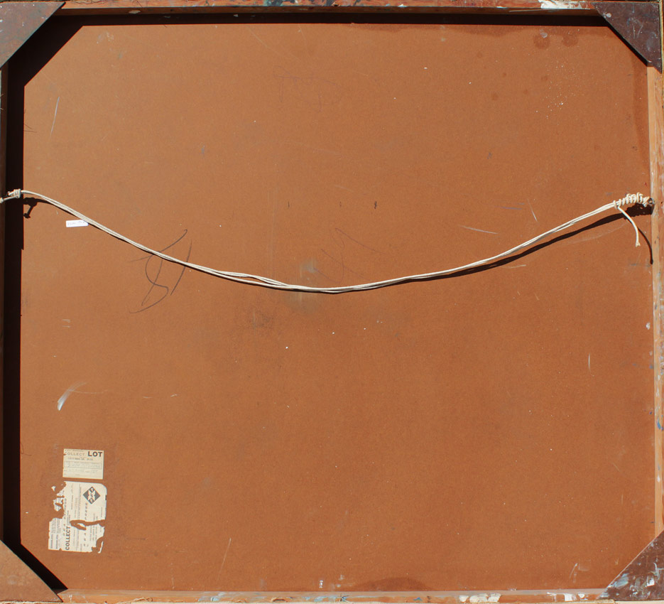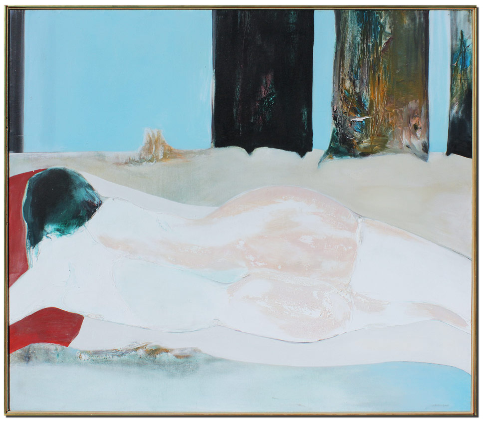 DAVIS, Jerrold, (American, 1926- ): Post Abstract Colorist Composition Depicting the Back of a Nude Woman, Oil/Canvas, signed lower right, framed in a wood strip molding with joint separations 48'' x 54''.