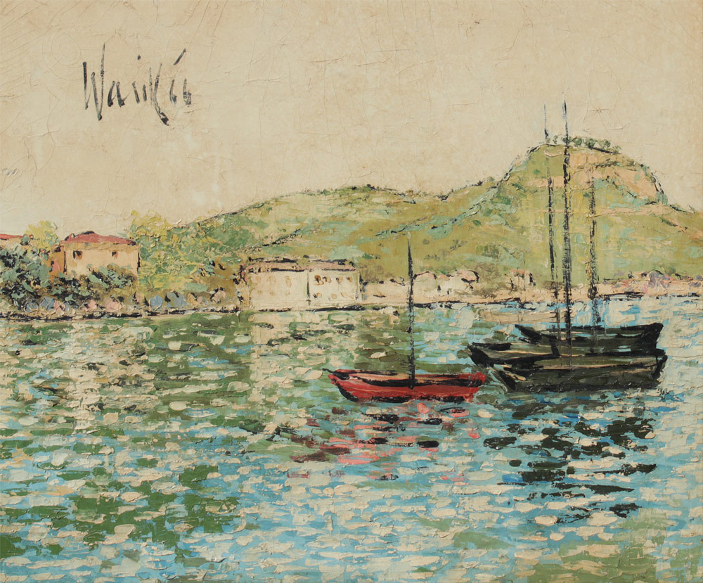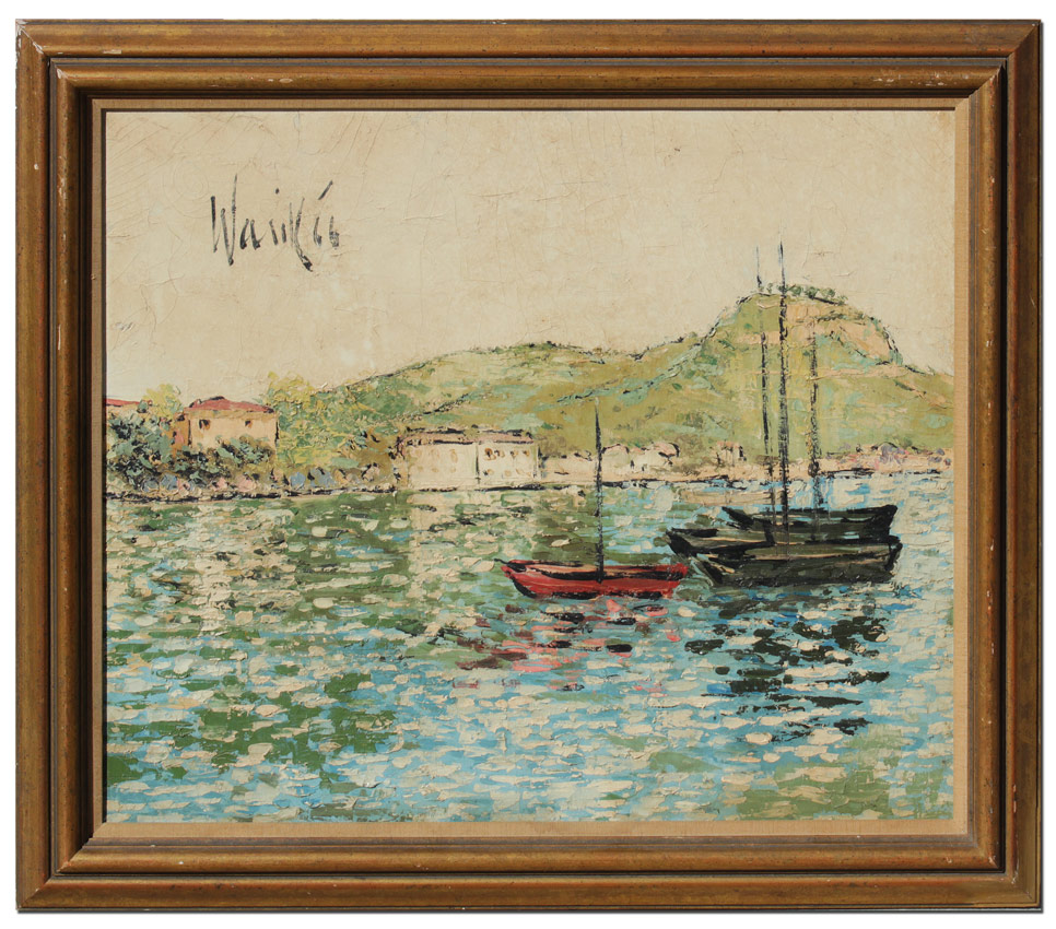 WHEATLEY, WARIK, (American, 1928-): Harbor Scene with Boats, Oil/Canvas, measures 20'' x 24'', signed upper left, dated '66, encased in gilded frame with wear 24 1/4'' x 28 1/4''.