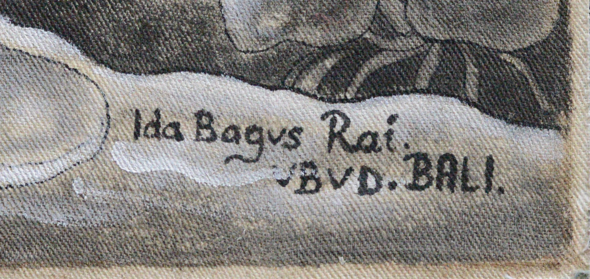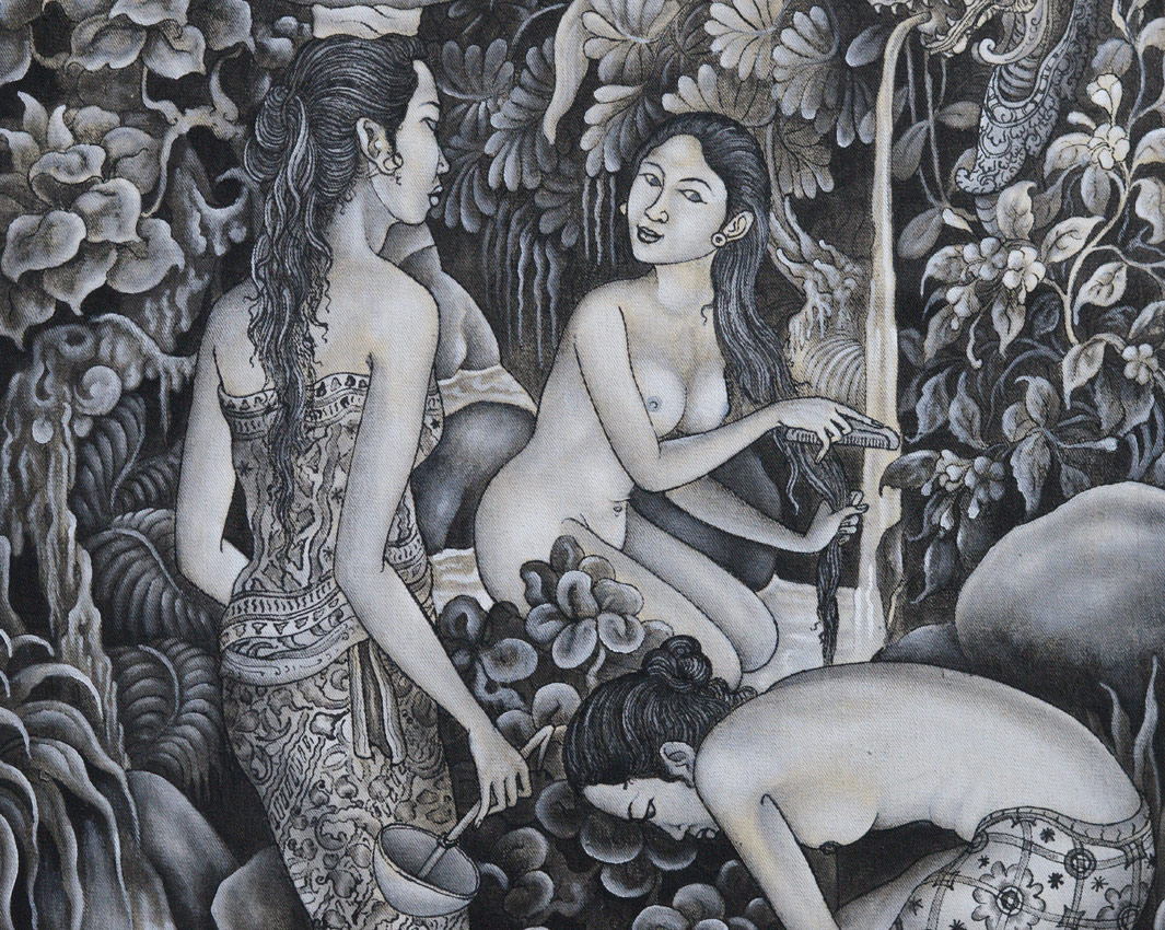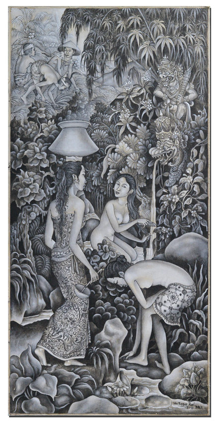 BALINESE EN GRISAILLES PAINTING OF NUDE AND SEMI-NUDE WOMEN BATHING AT A WATERFALL: Men in the Upper Corner are Watching, signed Ida Bagusrai, Bali, 36'' x 17 3/4''.